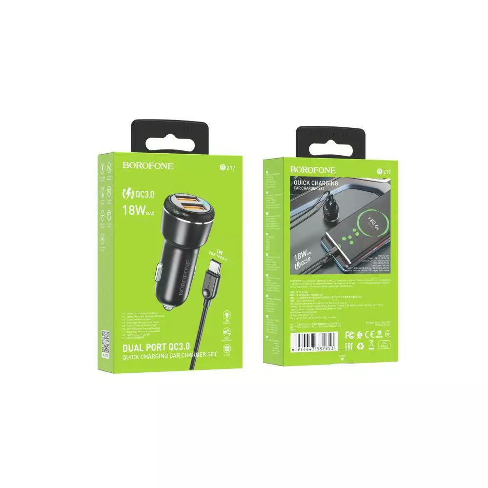 Автомобільний зарядний пристрій Borofone BZ17, QC3.0 18W, Cable Type-C, Black