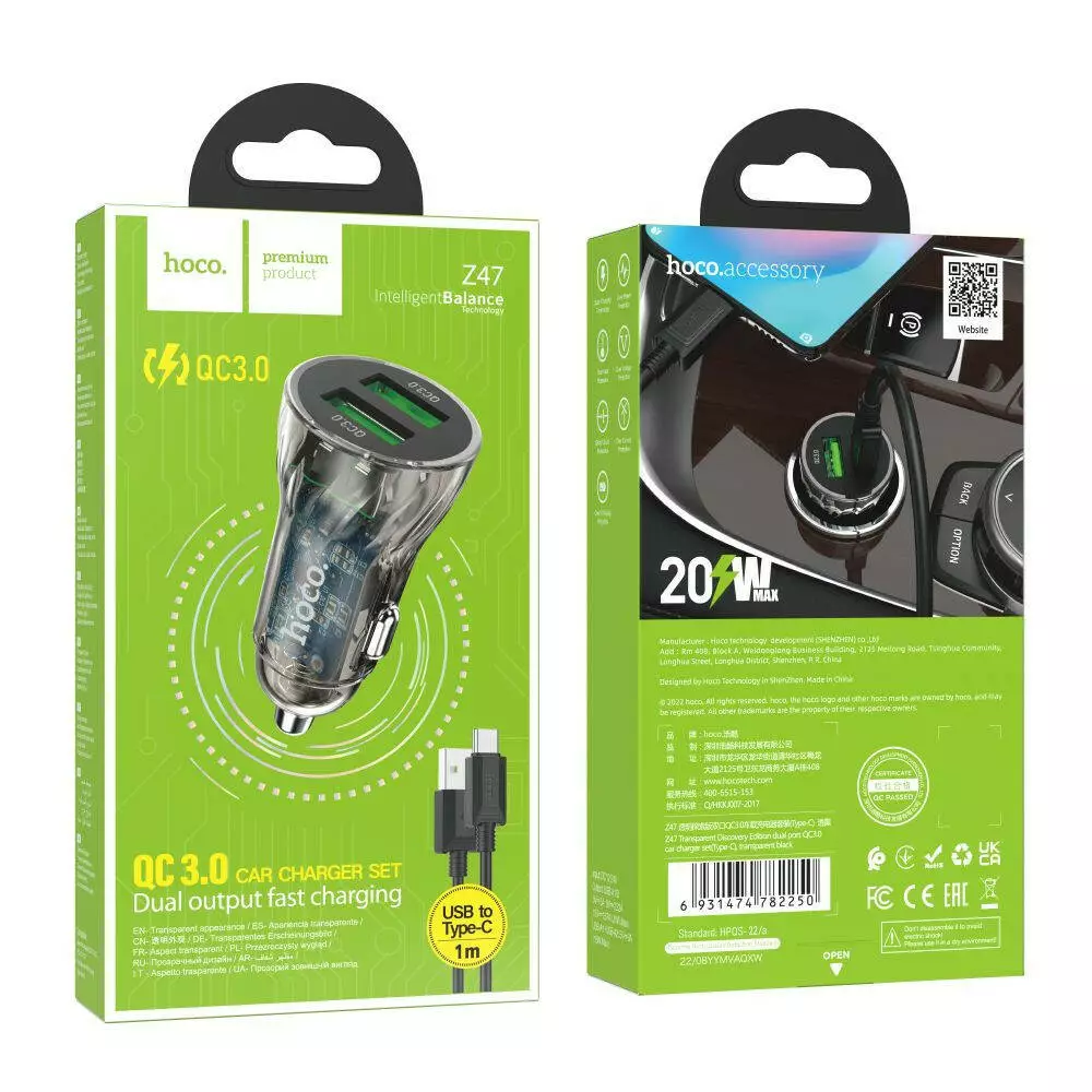 Автомобільний зарядний пристрій Hoco Z47 Transparent, QC 3.0 18W,