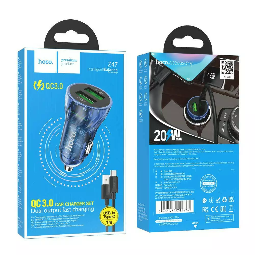 Автомобільний зарядний пристрій Hoco Z47 Transparent, QC 3.0 18W, Cable Type-C, Blue