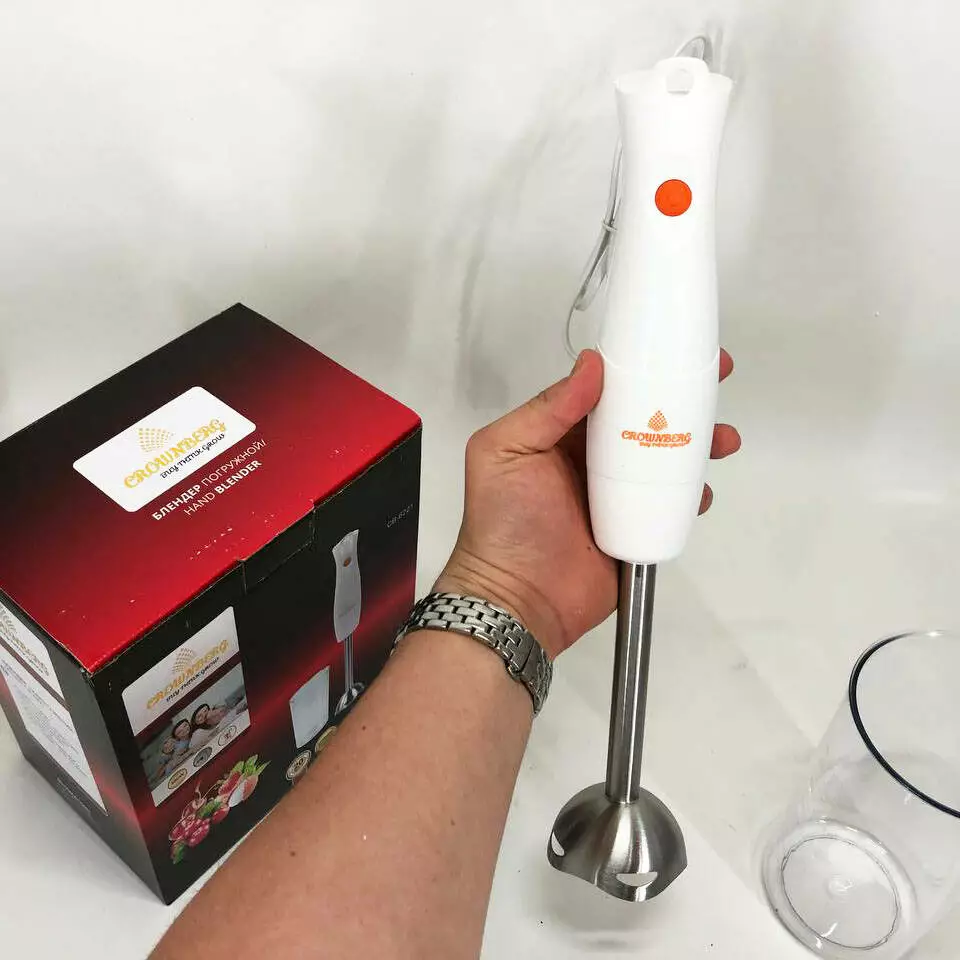 - Ручной блендер со стаканом Crownberg CB 6221 всегда поможет когда необходимо измельчить какие-либо продукты, например: фрукты, овощи, мясо и т.д.
