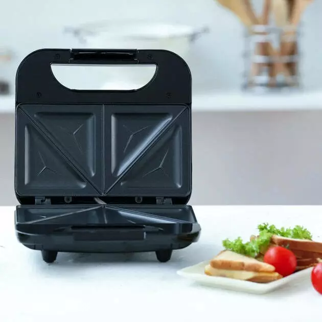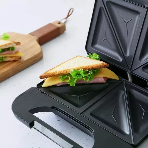 Одновременно, в ней можно выпекать сразу по 4 сэндвича, края которых плотно спаиваются бортиками форм, надежно запирая начинку внутри.