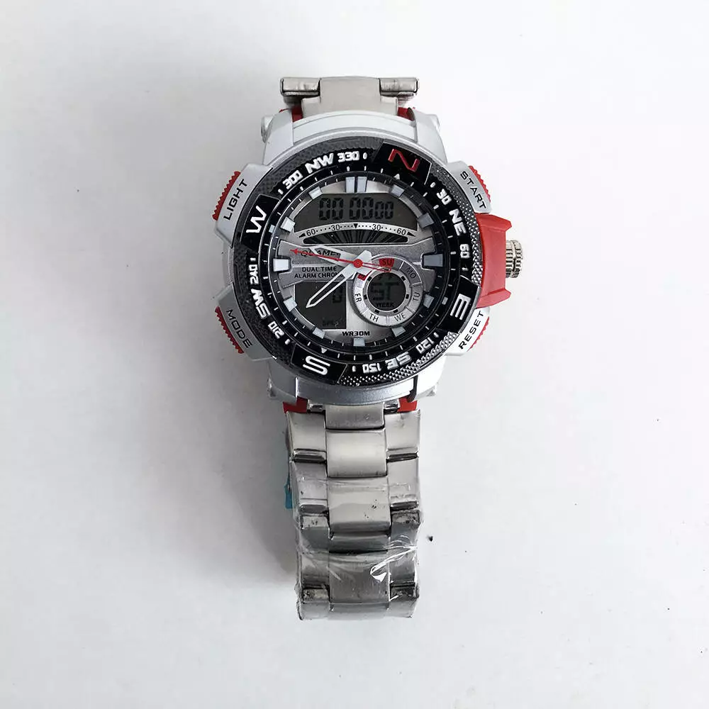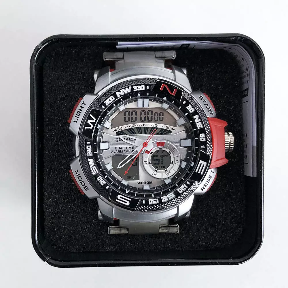 Часы наручные QUAMER в коробке, браслет карбон, dual time, waterproof с красными вставками