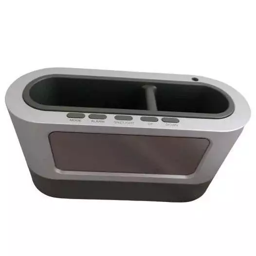 Часы-подставка для ручек изготовлены в пластиковом корпусе, они имеют компактные габариты и не занимают много места на столе.