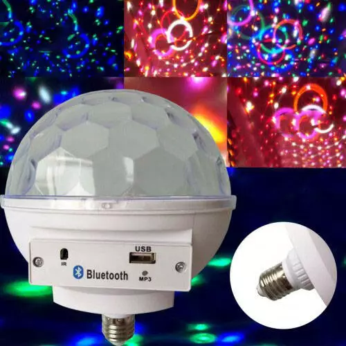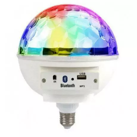 Диско шар LED Cryst almagic ball light E27 997 BT имеет компактный дизайн в виде лампы, вкручивающейся в стандартный патрон, встроенный модуль беспроводного подключения Bluetooth и USB вход для подключения флешек с музыкой в MP3 формате.