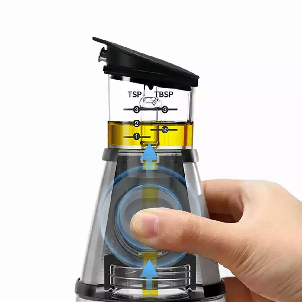 Дозатор для растительного масла имеет основной контейнер, в который и помещают жидкость. При желании можно в него поместить не только масло, но и уксус. Такие бутылки отлично подходят для хозяек, которые любят на кухне использовать несколько видов масла и уксуса. Также приспособление оборудовано специальным дозатором. Это позволяет выдавать необходимое количество жидкости. Для того чтобы бутылка могла выполнять эту функцию, есть специальная кнопка. При нажатии на нее выделяется необходимое количество масла.