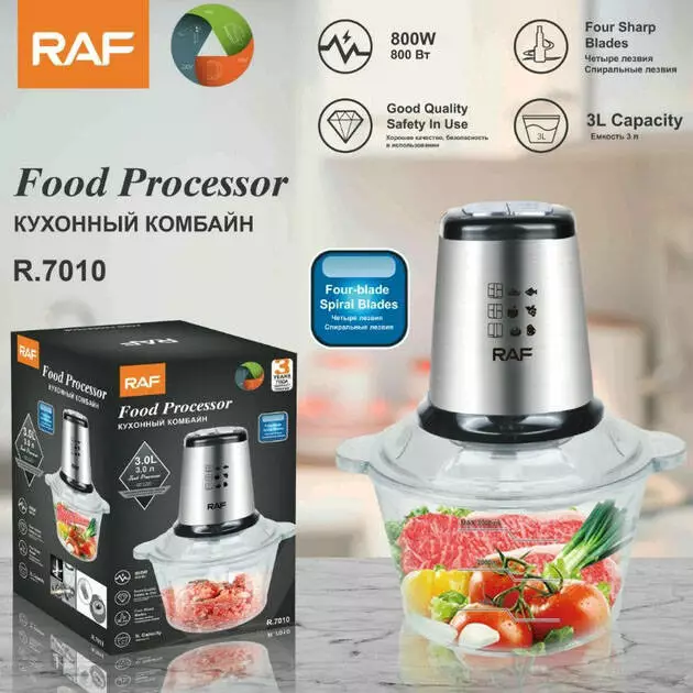 Электрический измельчитель RAF- сочетает в себе блендер, миксер и измельчитель продуктов! Измельчитель пригодится Вам во время приготовления различных блюд на кухне. Измельчитель овощей нарезает их быстро, при этом облегчая и ускоряя процесс готовки блюд. При однократном нажатии Вы получите отличную нарезку!!! Кухонный блендер безопасный и быстрый, и гораздо эффективнее чем кухонный нож. Чтобы быстро измельчить перец, лук, зелень, сельдерей, вареные яйца, яблоки, помидоры, чеснок - с этим быстро справится кухонный измельчитель с двумя лезвиями. Благодаря острым лезвиям RAF позволяет быстро измельчать и смешивать продукты! Подходит для приготовления коктейлей и смузи.