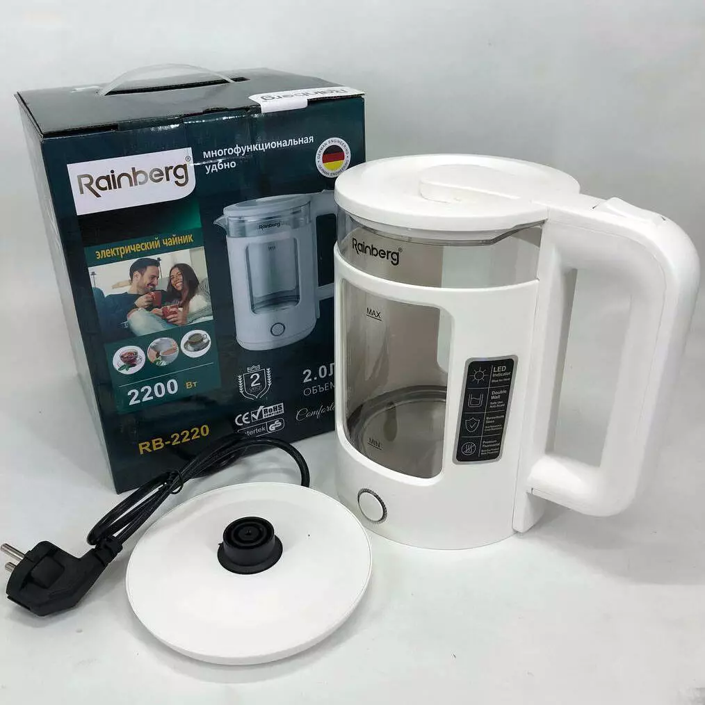 Электрочайник Rainberg RB-2220 стеклянный, дисковый прозрачный. Чайник с подсветкой 2200W. Цвет: белый