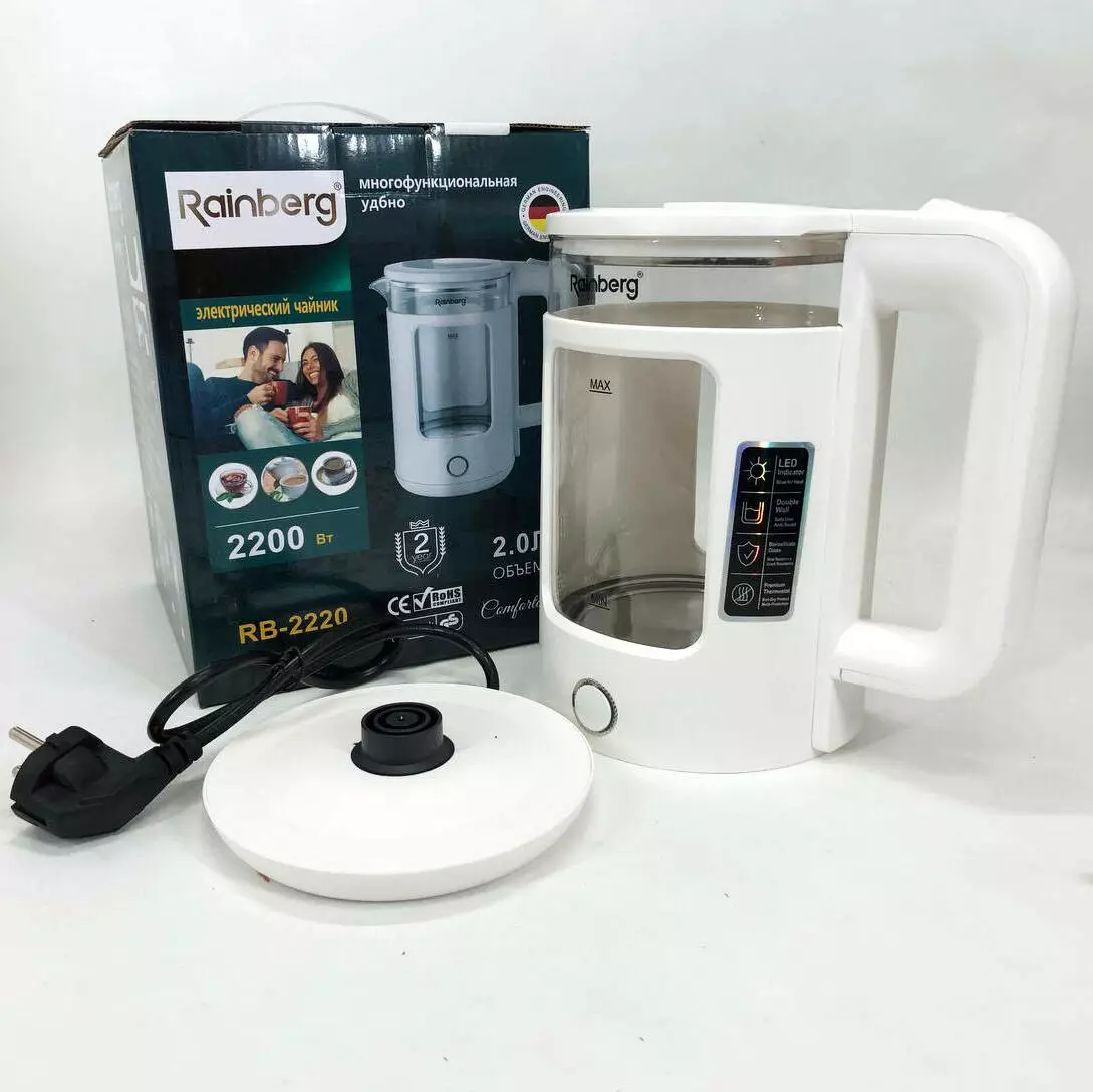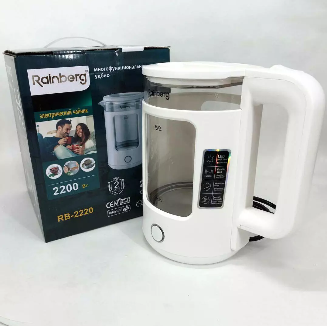 Корпус электрочайника Rainberg RB-2220 изготовлен из стекла и пластика высокого качества. Чайник имеет удобную и обтекаемую форму ручки, на которой расположены кнопки вкл./выкл.