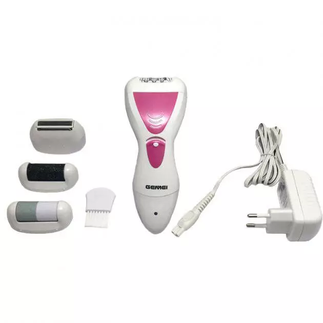 Эпилятор Gemei GM 7006 имеет 4 насадки: основная для качественной эпиляции, бритвенная с двойным лезвием и триммером для легкого сбривания, насадка-пемза для избавления от мозолей, натоптышей, огрубевшей кожи на ступнях, насадка для филировки.