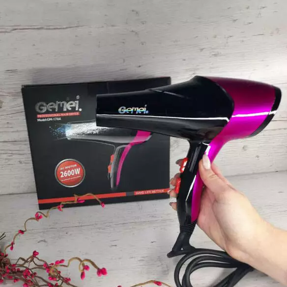 Фен GEMEI GM-1766 2.6 кВт АС – удобный и практичный инструмент, отличается ярким стильным дизайном и доступной ценой с широким набором функций. Он бережно и быстро высушит волосы, также Вы сможете придать волосам эффектную форму и объем, и зафиксировать их с помощью функции “холодный воздух”. Благодаря мощности в 2600 Вт, выходящий воздух нагревается практически мгновенно. Вы можете регулировать скорость потока воздуха и температуру нагрева. Отключение модели при перегреве позволит продлить срок его службы и обеспечит его наиболее безопасную эксплуатацию.