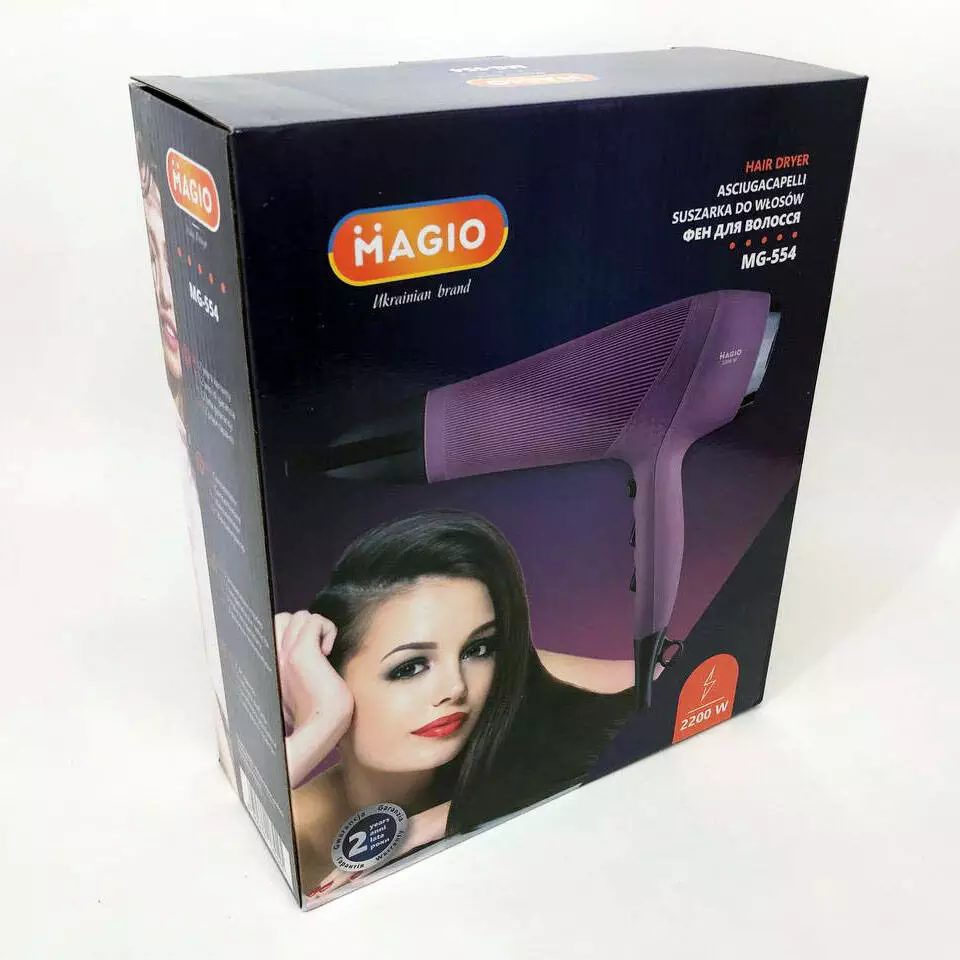 Фен Magio MG-554 представляет собой невероятно стильный прибор для укладки волос. Это устройство великолепно продумано внешне и по функциональной части. Вам стоит внимательно присмотреться к данной модели, если хотите получить практичный и, одновременно, дизайнерски оформленный инструмент для укладки волос в бытовых условиях. Яркий корпус в фиолетовом цвете с черными элементами точно сможет разбавить собою любой интерьер, а хранение его не составит никаких сложностей – на нем имеется петля для подвешивания. Украсьте свой туалетный столик выносливым и продуктивным в эксплуатации изделием!