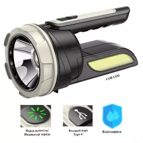 - Количество режимов работы: 4 (5W - 100%, 5W - 50%, 5W - стробоскоп, COB - 100%)