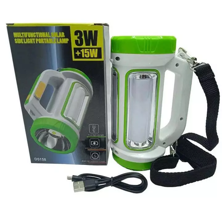 Переносной фонарь-повербанк на солнечной батарее D-5158 имеет центральный мощный фонарь 3 W (он дает очень яркий с четко выраженным фокусом луч света и более тусклым светом по окружности). Такое решение освещенности одновременно можно использовать и для освещения дороги и для просмотра окружающего вдалеке пространства. На корпусе по периметру фонарика D-5158 расположен трех сторонний светильник с матовым светофильтром. С помощью металлической душки можно подвесить фонарь над столом, что так же добавит дополнительный комфорт в ночное время.