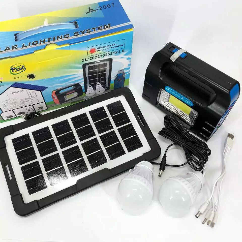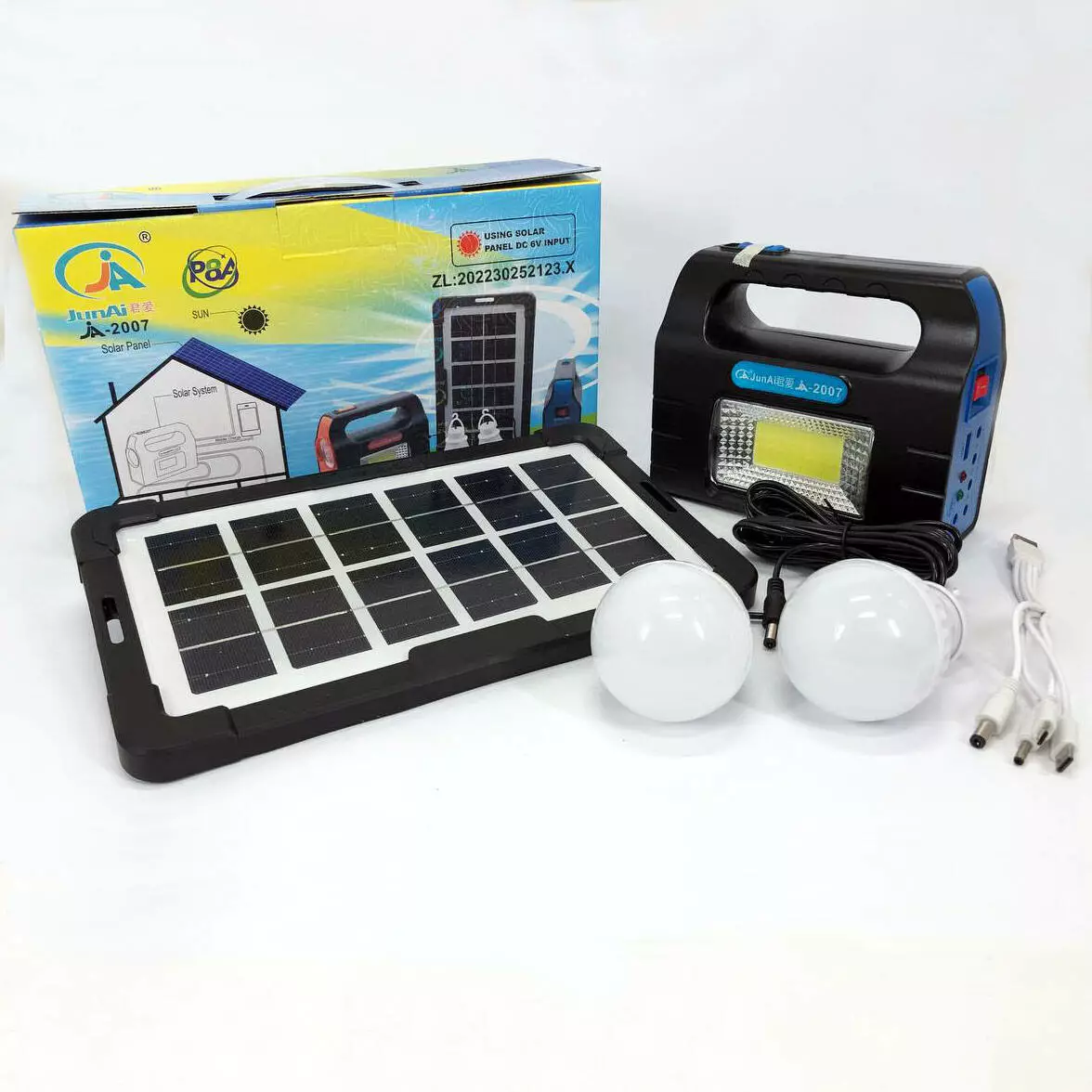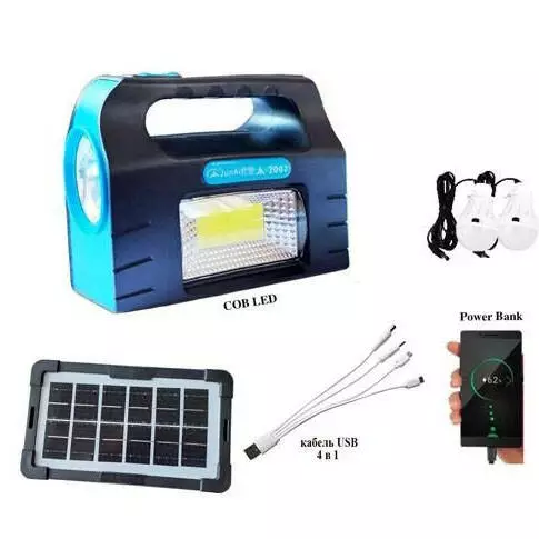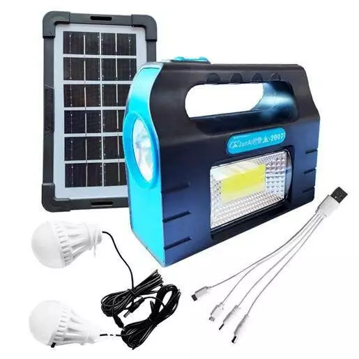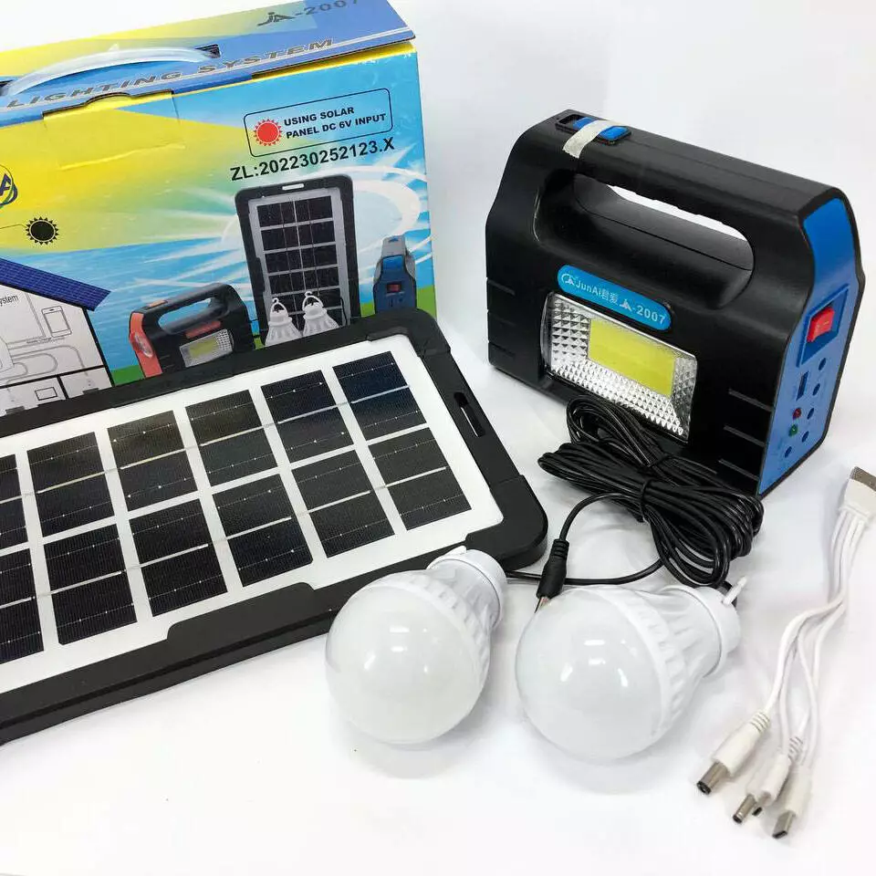 Фонарь портативный на солнечной батарее JA-2007 солнечная зарядная станция + 2 лампочки. Цвет: голубой