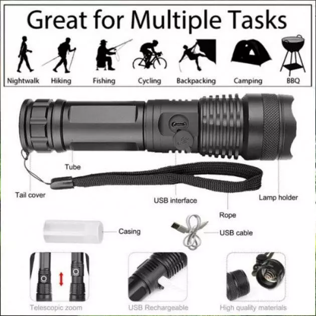 Корпус ручного фонаря изготовлен из металла (анодированного алюминия) черной окраски, ударопрочный, защищен от влаги и пыли. Кнопка включения и переключения режимов находится на ручке в удобном месте. Фонарик снабжен оптическим зумом для регулировки диаметра светового пятна. К крышке на задней части прикреплен ремешок для фиксации на руке с регулятором.
