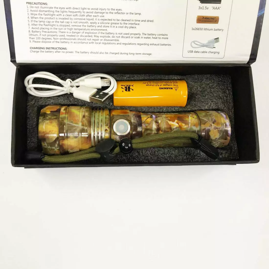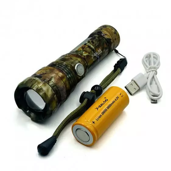 Фонарик ручной Bailong BL-P512M-P90. Окрашен в камуфляжном стиле. Фонарь специально выполнен в противоударном (металл – анодированный алюминий), стойком от влаги и пыли корпусе.