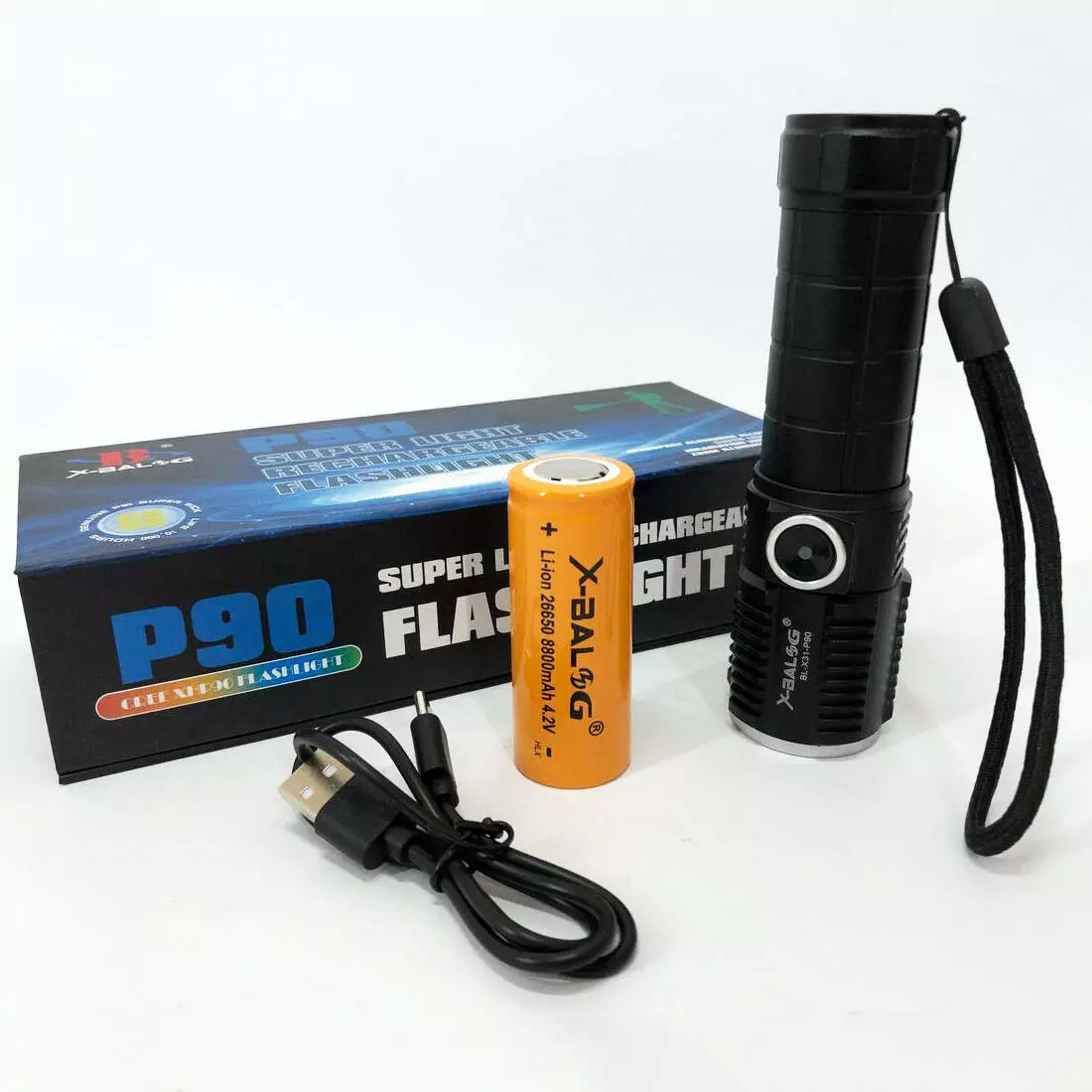 В комплект входят: фонарик X-BALOG BL-X31-P90 L-091, литий-ионная батарея 26650, кабель USB, адаптер для батареек типа ААА, ручной шнурок, коробка.