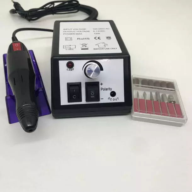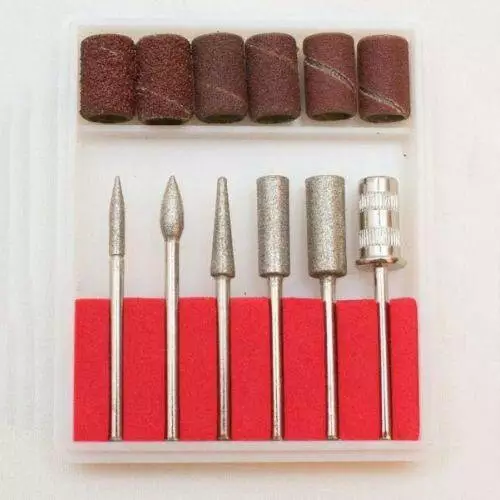- фрезы: 6 штук с алмазным напылением для удаления кутикулы, мозолей и грубых частей кожи, для обработки края ногтевой пластины, шлифовки, коррекции наращенных ногтей, чистки под ногтями.