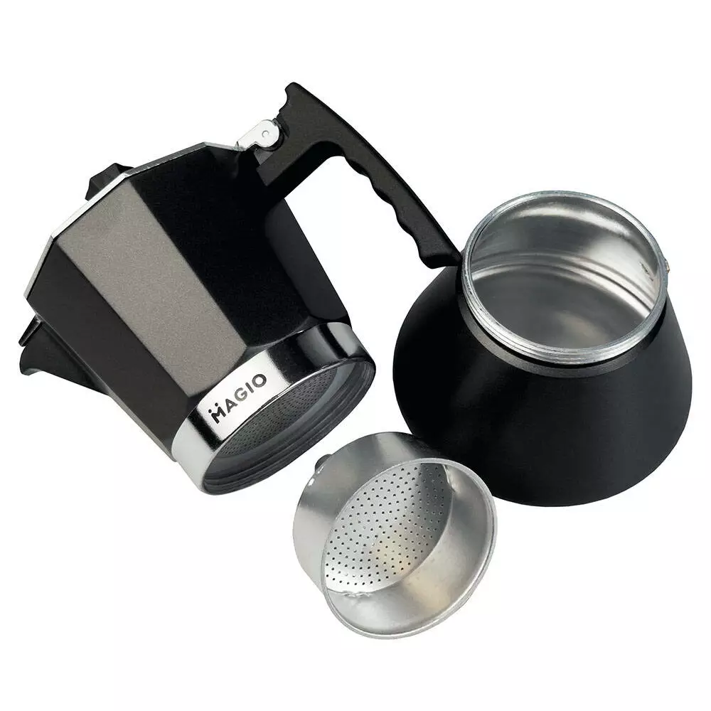 Классическая гейзерная кофеварка MG-1001 прекрасно подходит для приготовления традиционного эспрессо. Изготовлен из безопасного алюминия, который может вступать в контакт с пищевыми продуктами, ручка из термостойкого пластика. Подходит для использования на газовых, электрических плитах и костре.