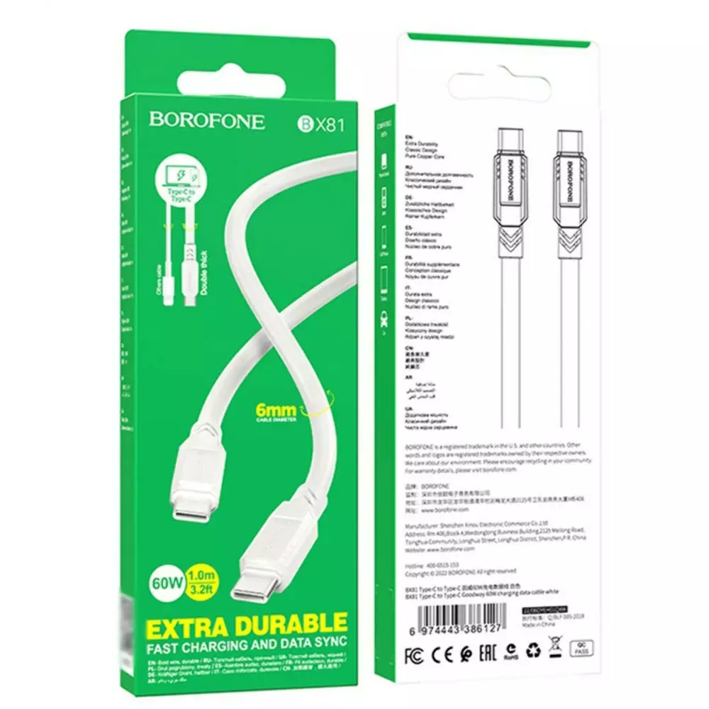 Кабель Borofone BX81, Type-C to Type-C, 1m, PD 60W, White
