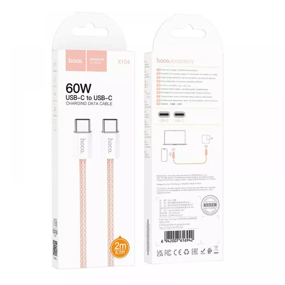 Кабель Hoco X104 Source, Type-C to Type-C, 2m, 60W, Pink