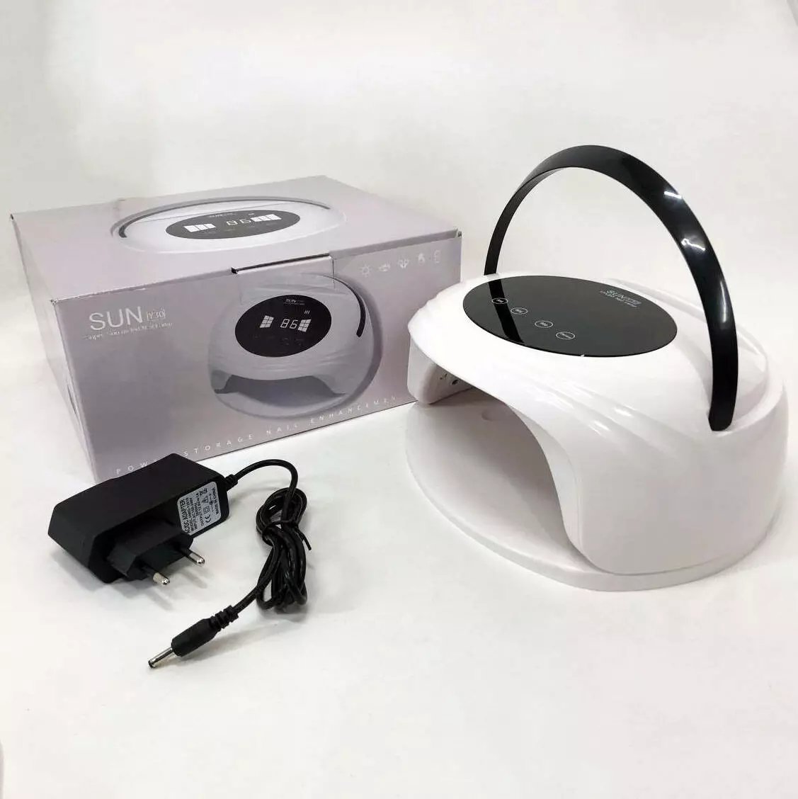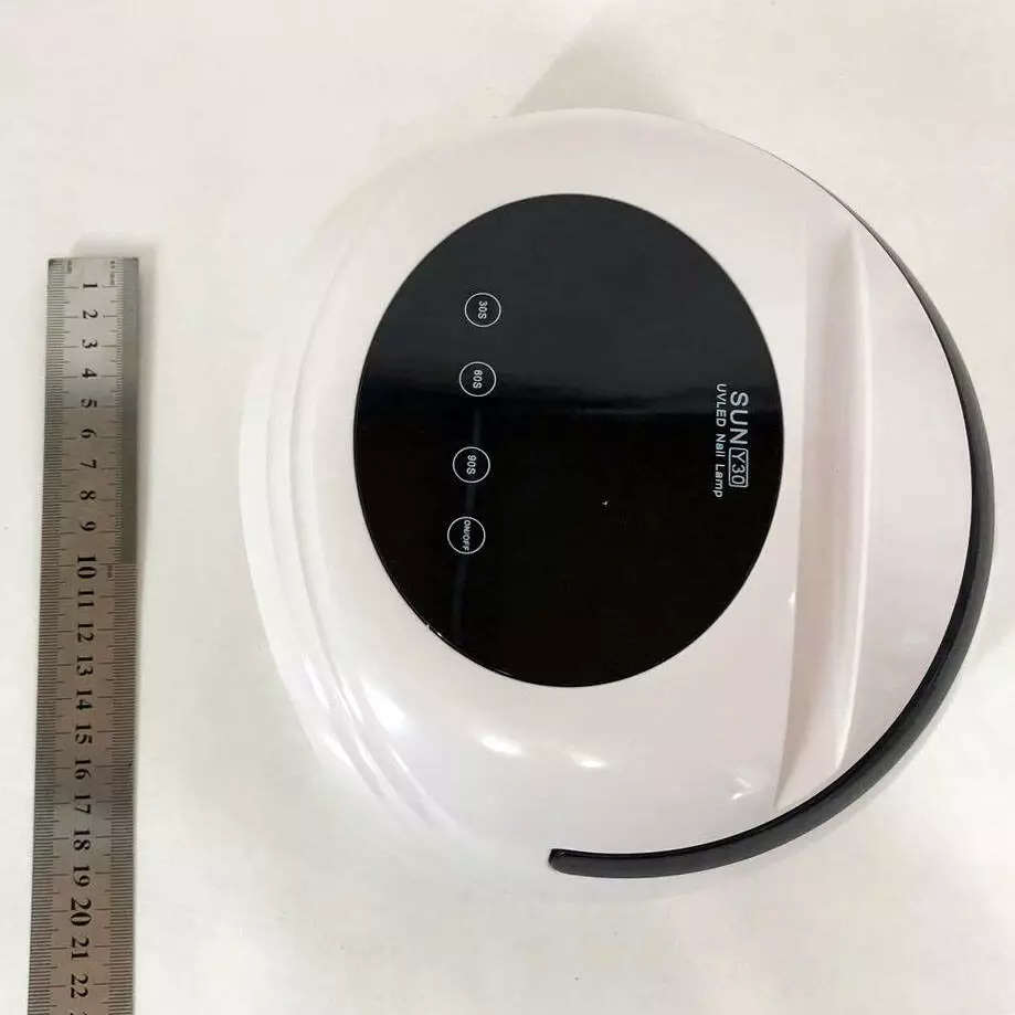 Портативная лампа SUN Y30 на 54 Вт для сушки гель-лака, геля на аккумуляторе имеет пластиковый корпус и 30 светодиодных глистерных ламп. Дно легко снимается. Кнопки таймеров сенсорны и есть электронное табло. Также на лампе есть ручка и отверстие, чтобы ставить туда мобильный телефон. Может работать и от сети. Заряжать аккумулятор нужно около 4 часов.