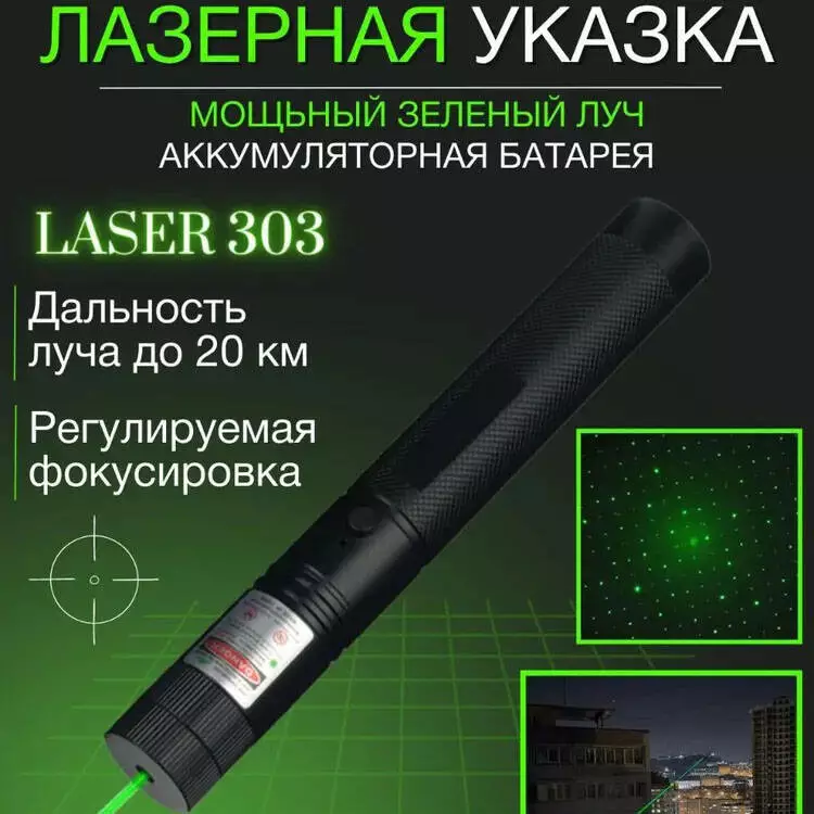 Лазер супер мощный Laser pointer YL-303 – мощная лазерная указка одна из самых яркихиз представленных на сегодняшний день. Лазерная указка позволяет в полнойтемноте видеть зеленый луч на расстоянии 10000 метров. Вдаль светит оченьдалеко и ярко. Луч лазера хорошо виден со стороны. Им удобно показывать наночном небе звезды и их созвездия. Особенно эффективно этот лазер светит втумане, при этом зеленый луч, проходя сквозь мельчайшие капельки тумана, оченьхорошо виден.