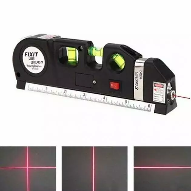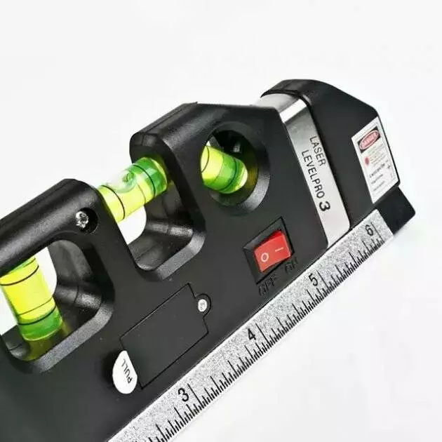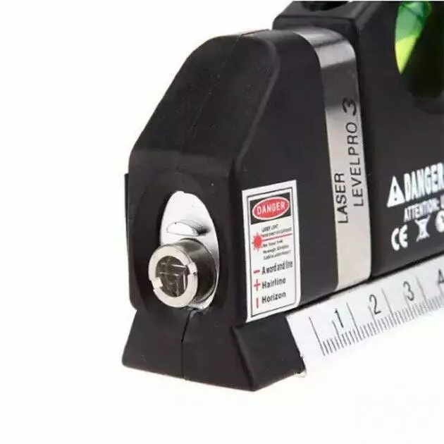 Качественный строительный уровень изготовлен из алюминиевой основы и крепкого ударопрочного пластика. Есть встроенная рулетка длиной 2,5 метра. На рулетке нанесены миллиметровые и дюймовые деления. Встроенный лазер позволяет проецировать на поверхность вертикальную, горизонтальную и крестообразную линии на расстояние до 15 метров. Кроме того он оснащён линейкой 15 см.
