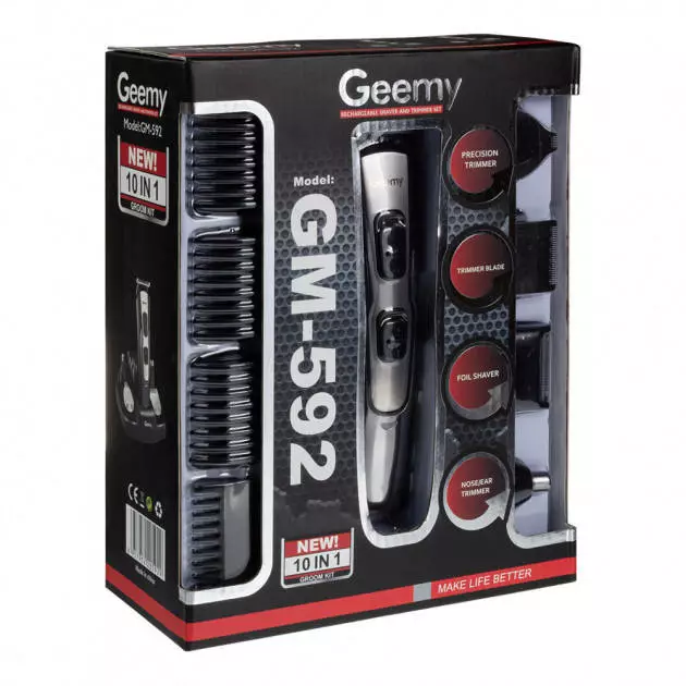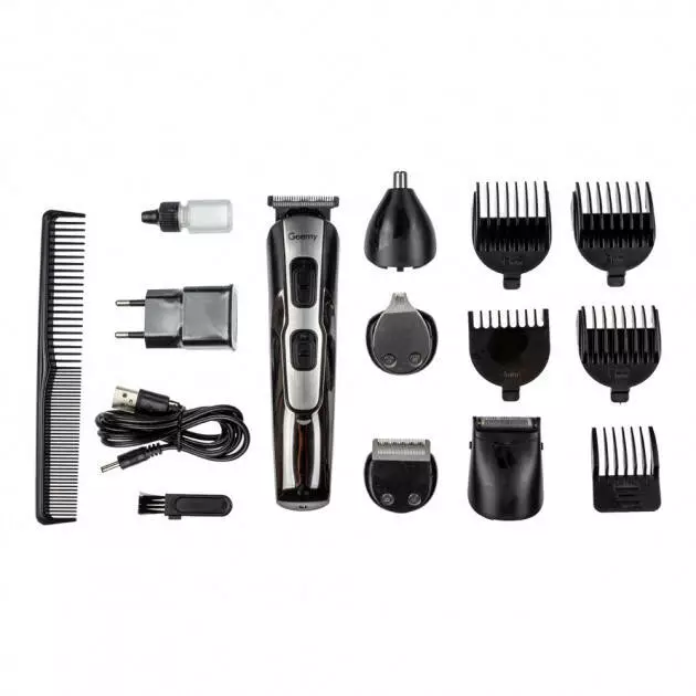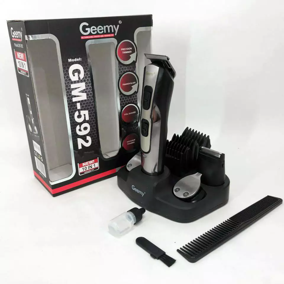GEMEI GM-592 9 в 1 отличный подарок для современного мужчины, который следит за своей внешностью и любит во всем аккуратность и организованность. На цельной подставке грамотно расположена сама машинка GEMEI GM-592 и сопутствующие ей аксессуары. Каждая из имеющихся с десяти насадок в наборе имеет свое строгое назначение, благодаря этому комплекту мужчина может поддерживать в идеальном состоянии свои усы и бороду, регулировать длину состригаемых волос, а также деликатно избавляться от лишних волос в носу и ушах.