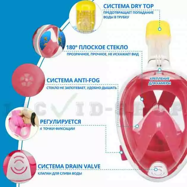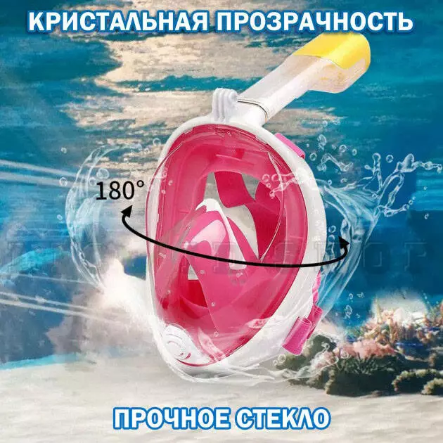 - панорамный обзор 180 градусов (Насладитесь панорамным видом под водой с обзором на 180 градусов. Мы гарантируем, что вы увидите больше рыб и подводных обитателей чем когда-либо. Интегрированное крепление под камеру, позволит закрепить вашу камеру, чтобы записать и поделиться приключениями с семьей и друзьями)