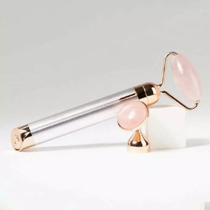 - Роликовый массажер Flawless Facial Roller поставляется с двумя насадками из розового кварца: лицевой ролик и пресс-насадка для массажа вокруг глаз.