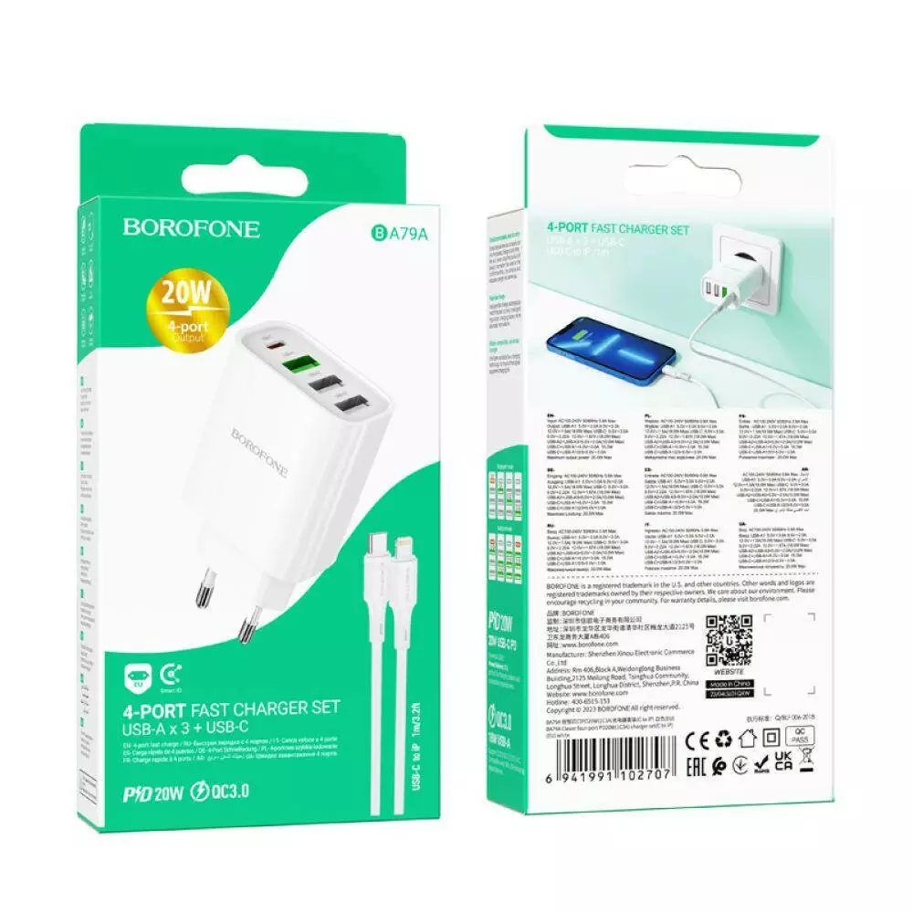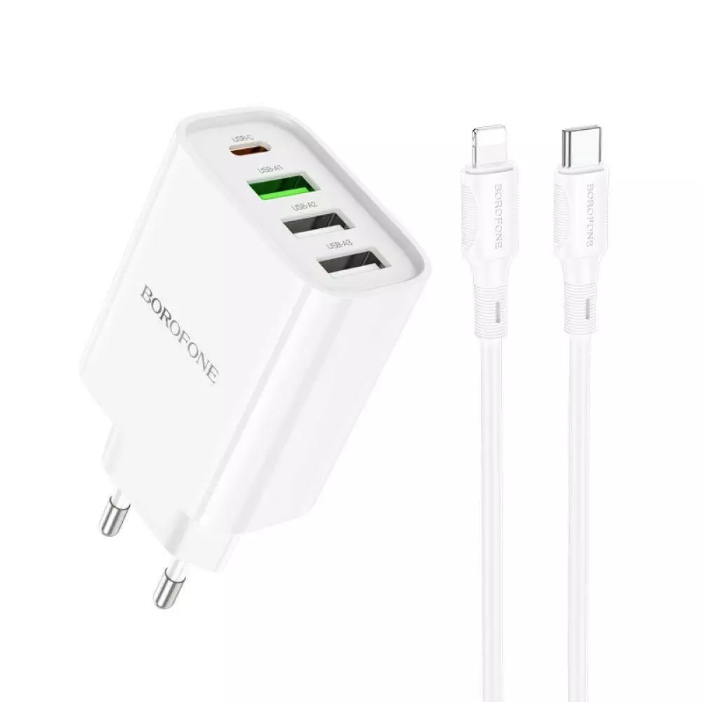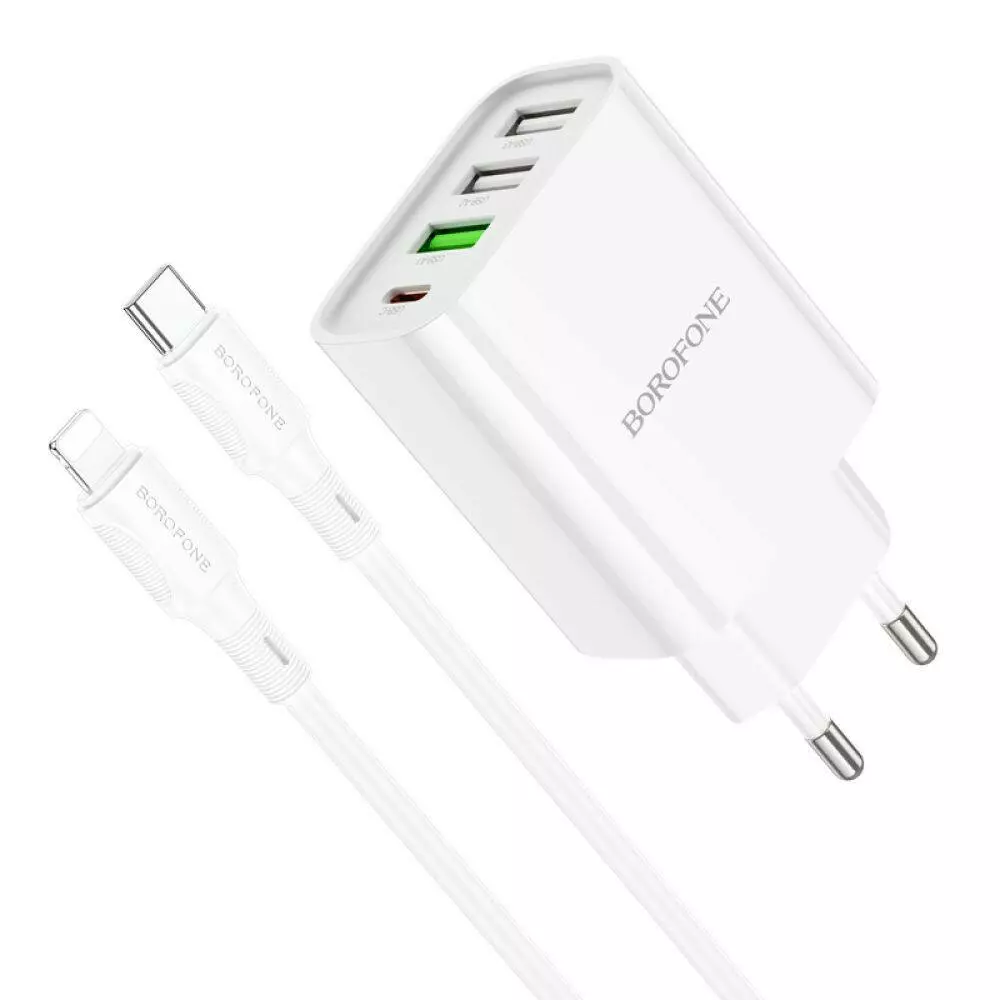 Мережевий зарядний пристрій Borofone BA79A, Cable Type C to Lightning, PD 20W, QC 3.0, White