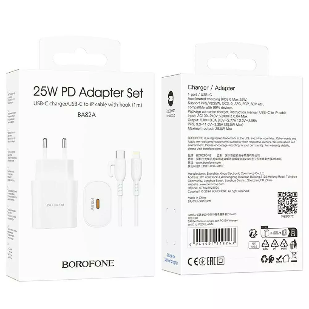 Мережевий зарядний пристрій Borofone BA82A, Cable Type-C to Lightning, PD 25W, QC 3.0, White