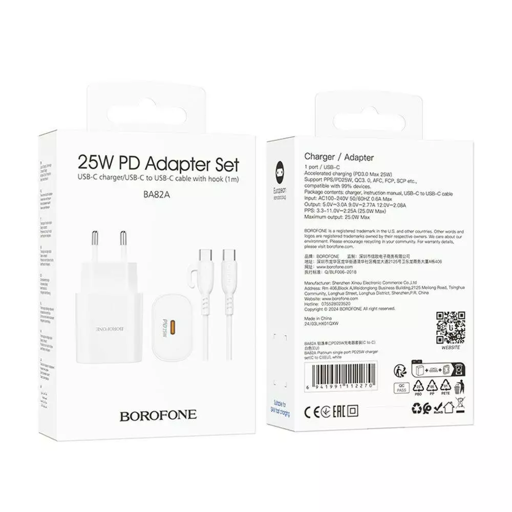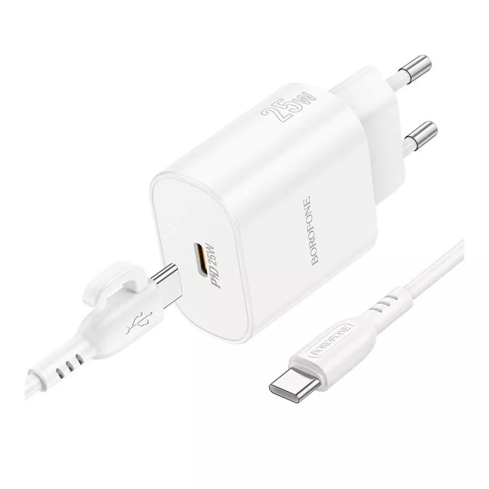 Мережевий зарядний пристрій Borofone BA82A, Cable Type-C to Type-C, PD 25W, QC 3.0, White