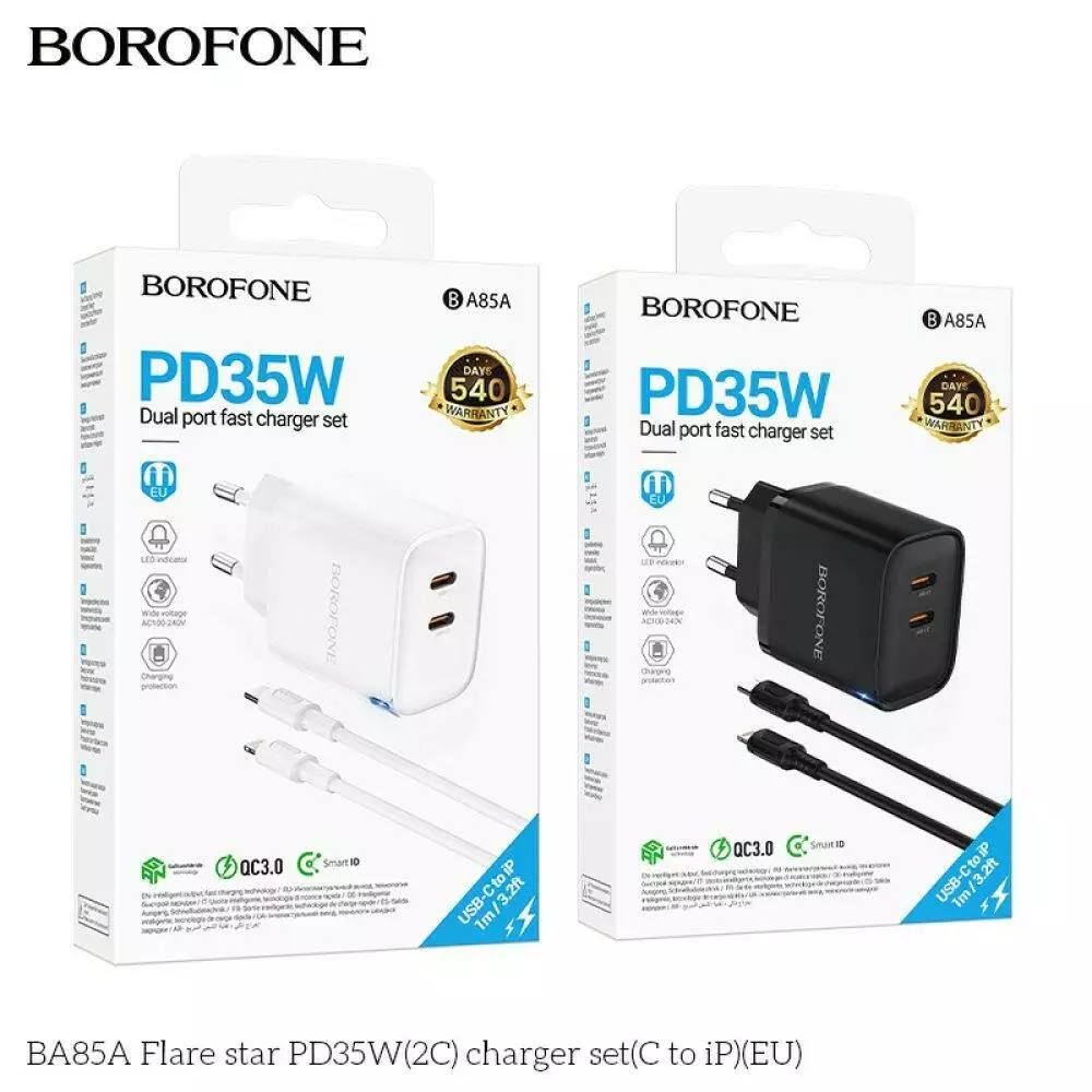 Мережевий зарядний пристрій Borofone BA85A, Cable Type-C to Lightning, PD 35W, QC 3.0, White