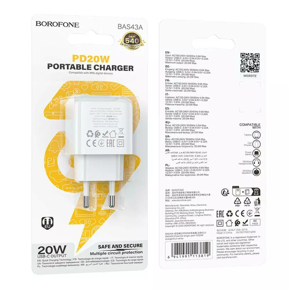 Мережевий зарядний пристрій Borofone BAS43A, PD 20W, QC 3.0, White