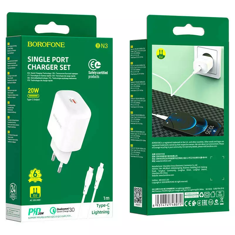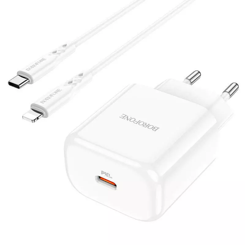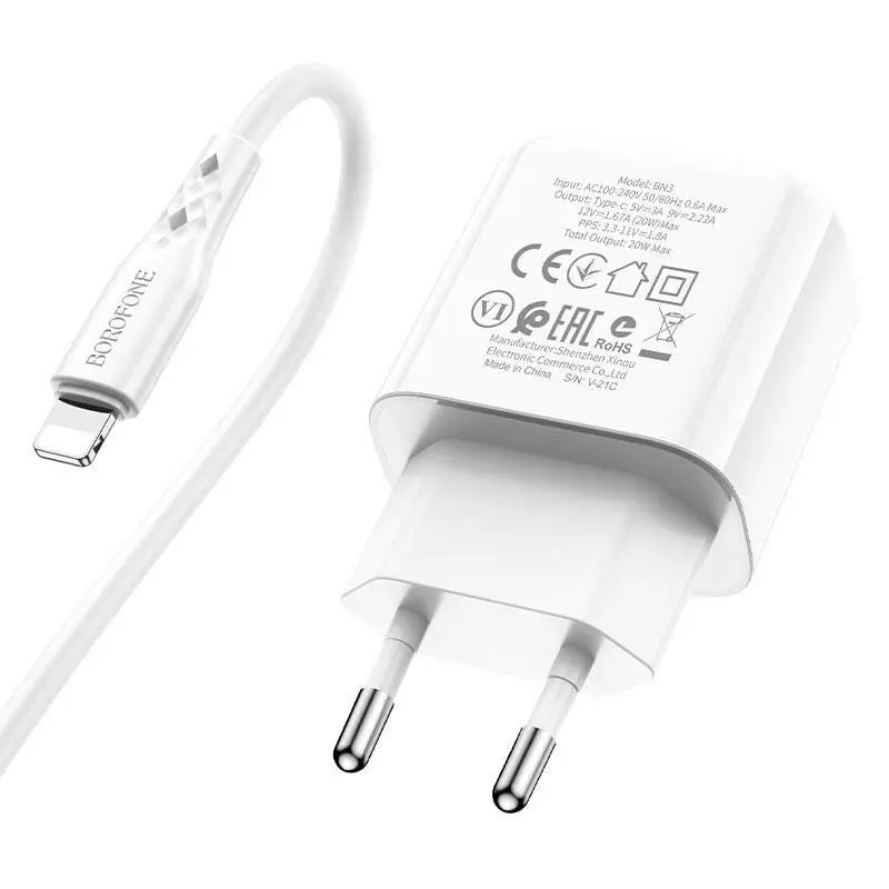 Мережевий зарядний пристрій Borofone BN3, Cable Type-C to Lightning, PD 20W, QC 3.0, White