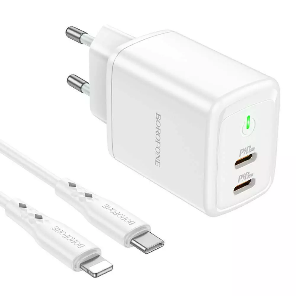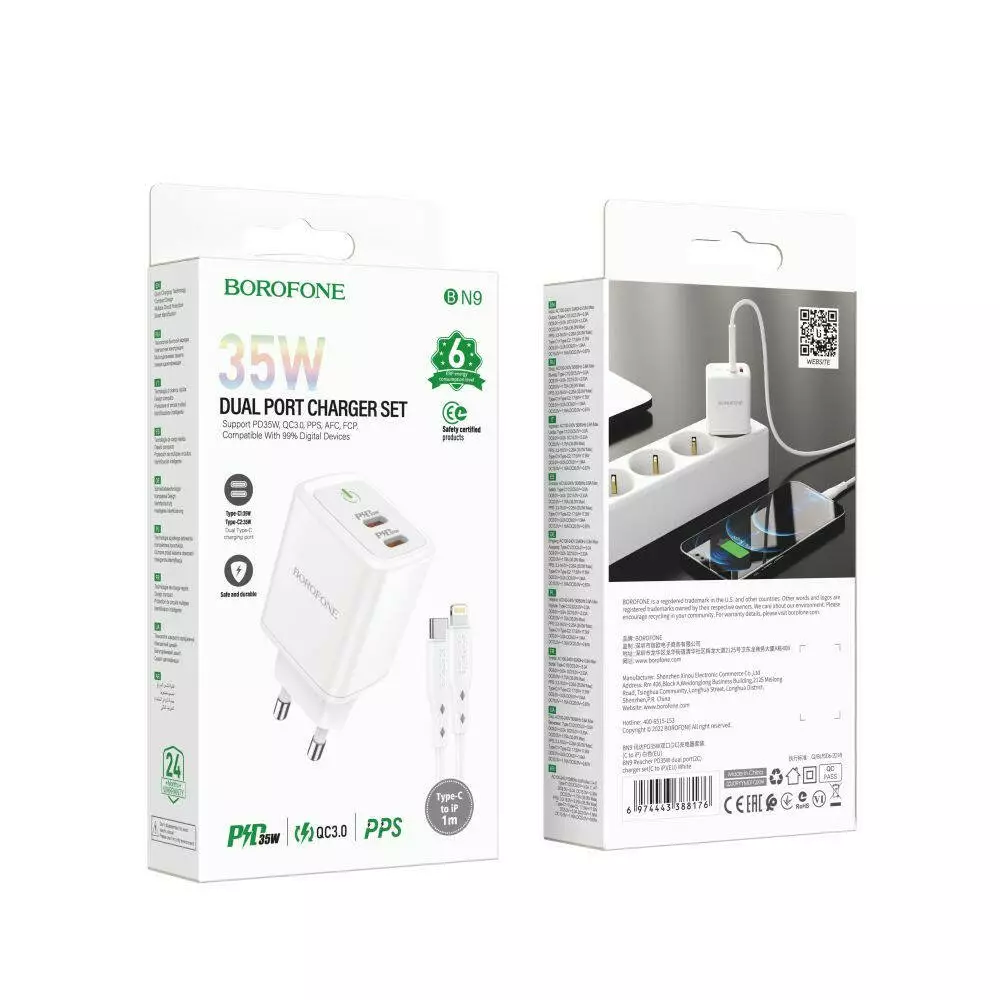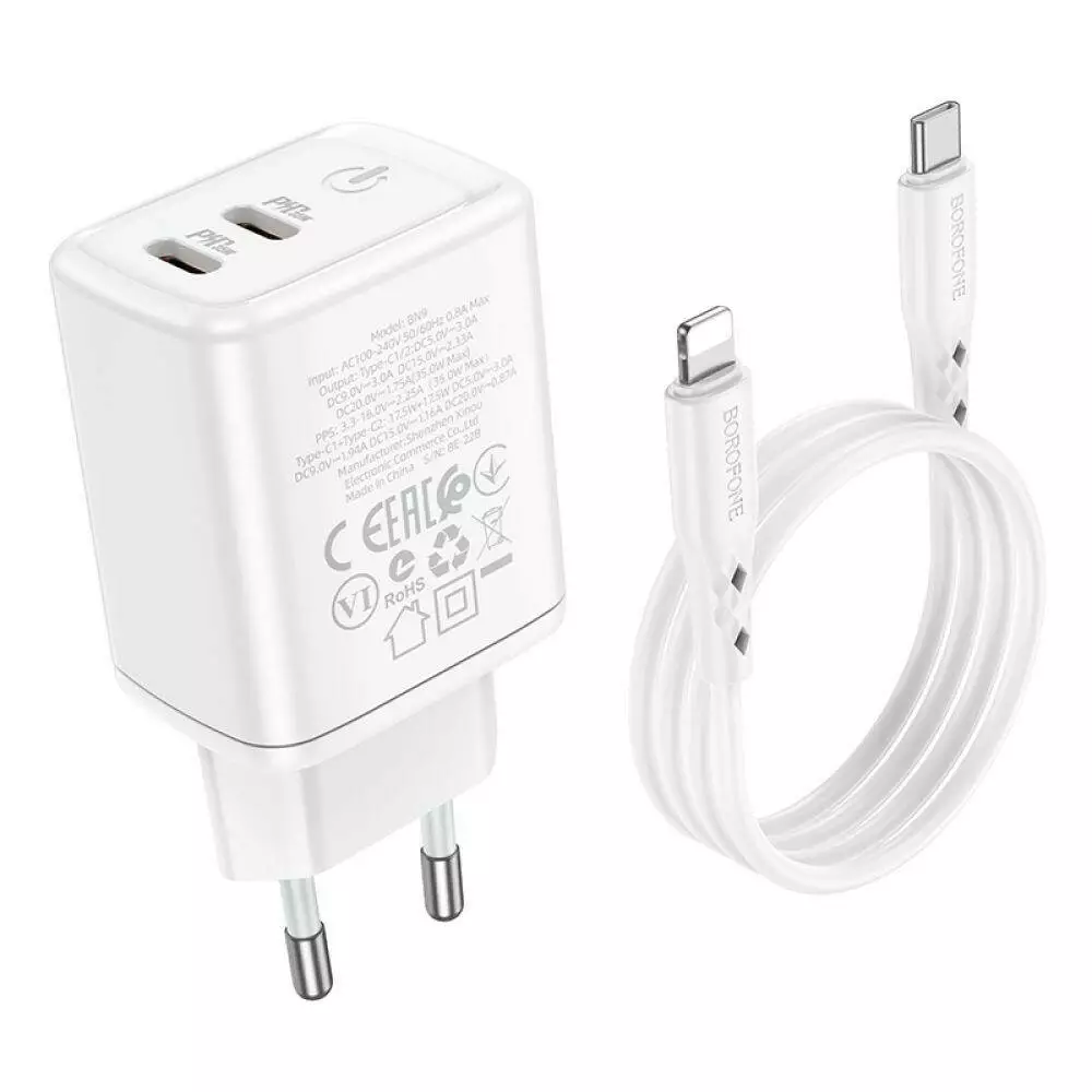 Мережевий зарядний пристрій Borofone BN9, Cable Type-C to Lightning, PD 35W, QC 3.0, White