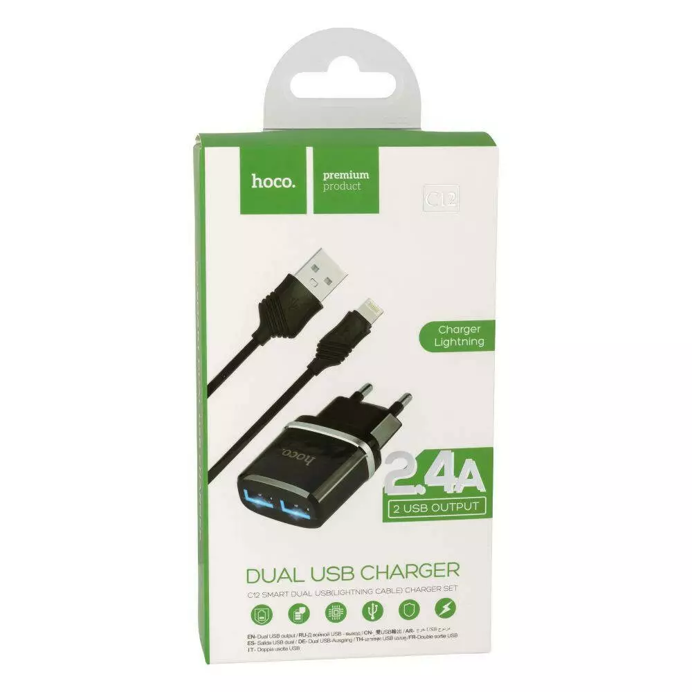 Мережевий зарядний пристрій Hoco C12, Cable Lightning, 2.4A, Black