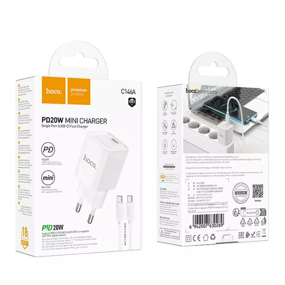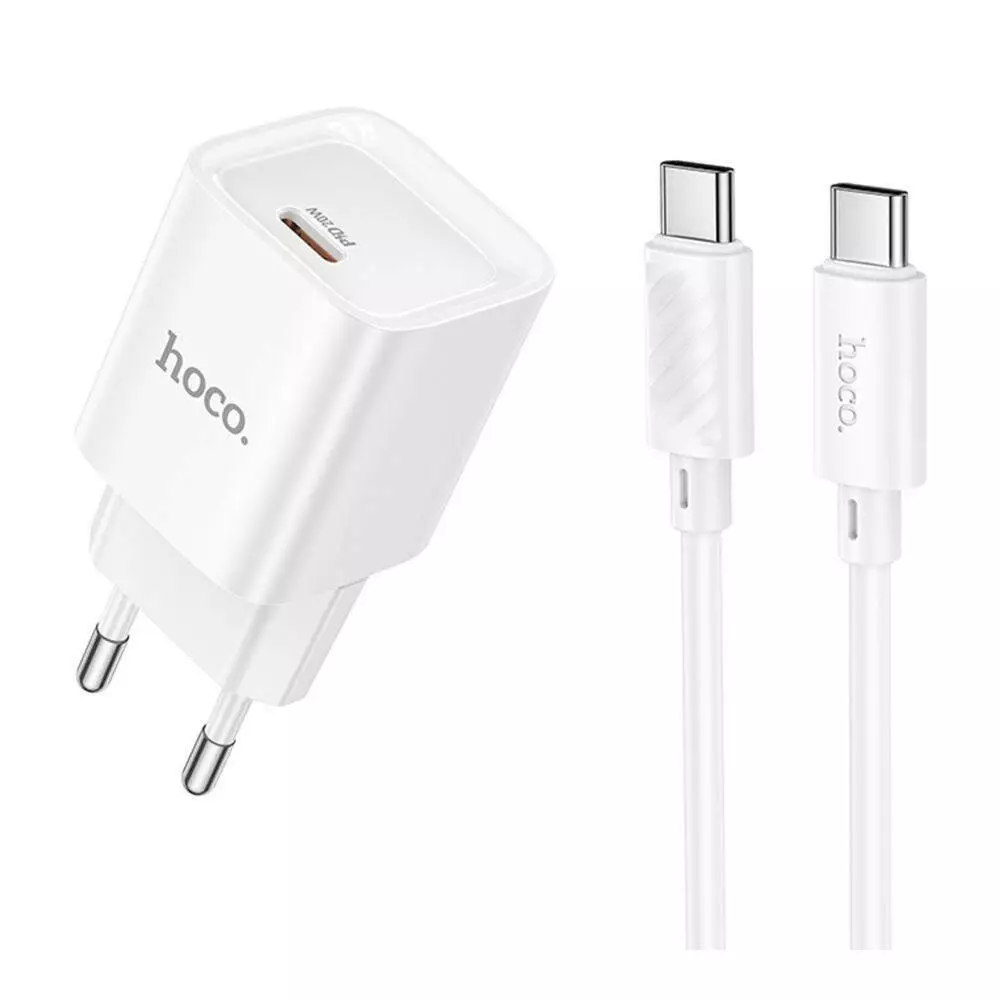 Мережевий зарядний пристрій Hoco C146A, Cable Type-C to Type-C, PD 20W, QC 3.0, White