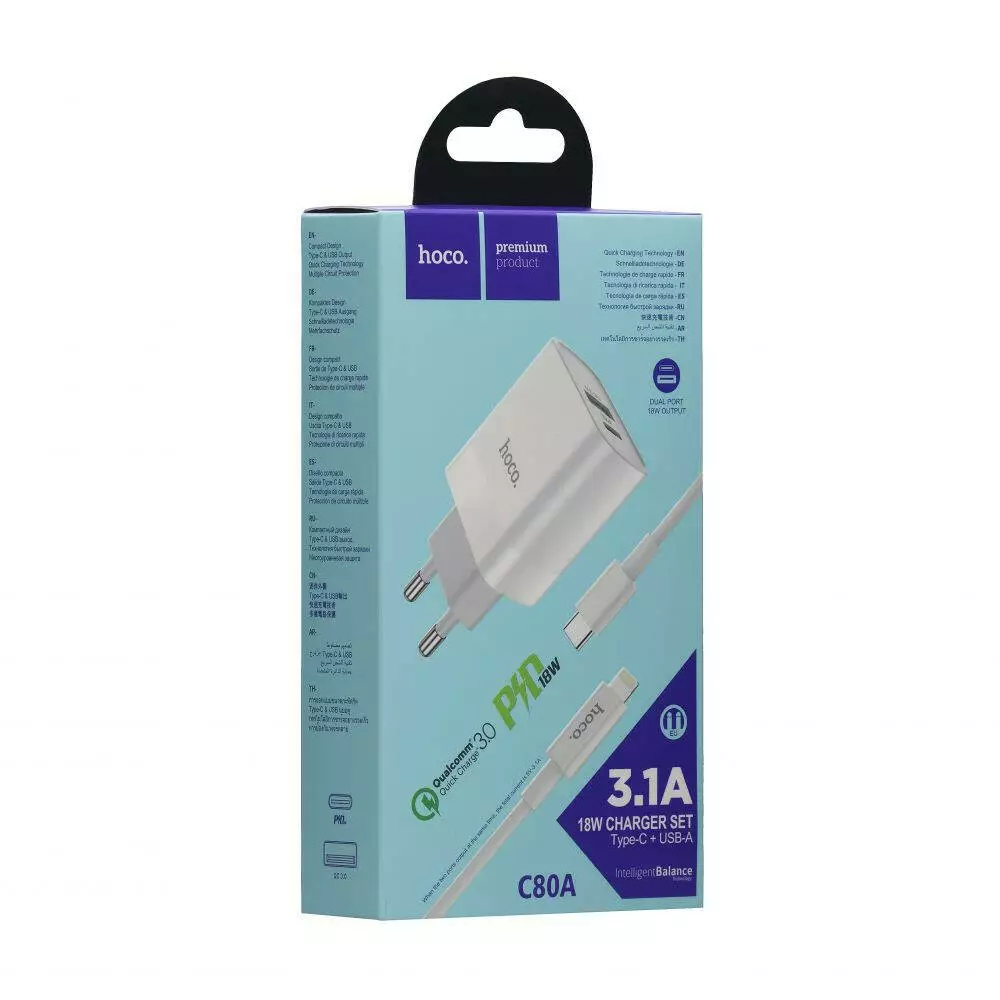 Мережевий зарядний пристрій Hoco C80A, Cable Type-C to Lightning, PD 20W, QC3.0, White