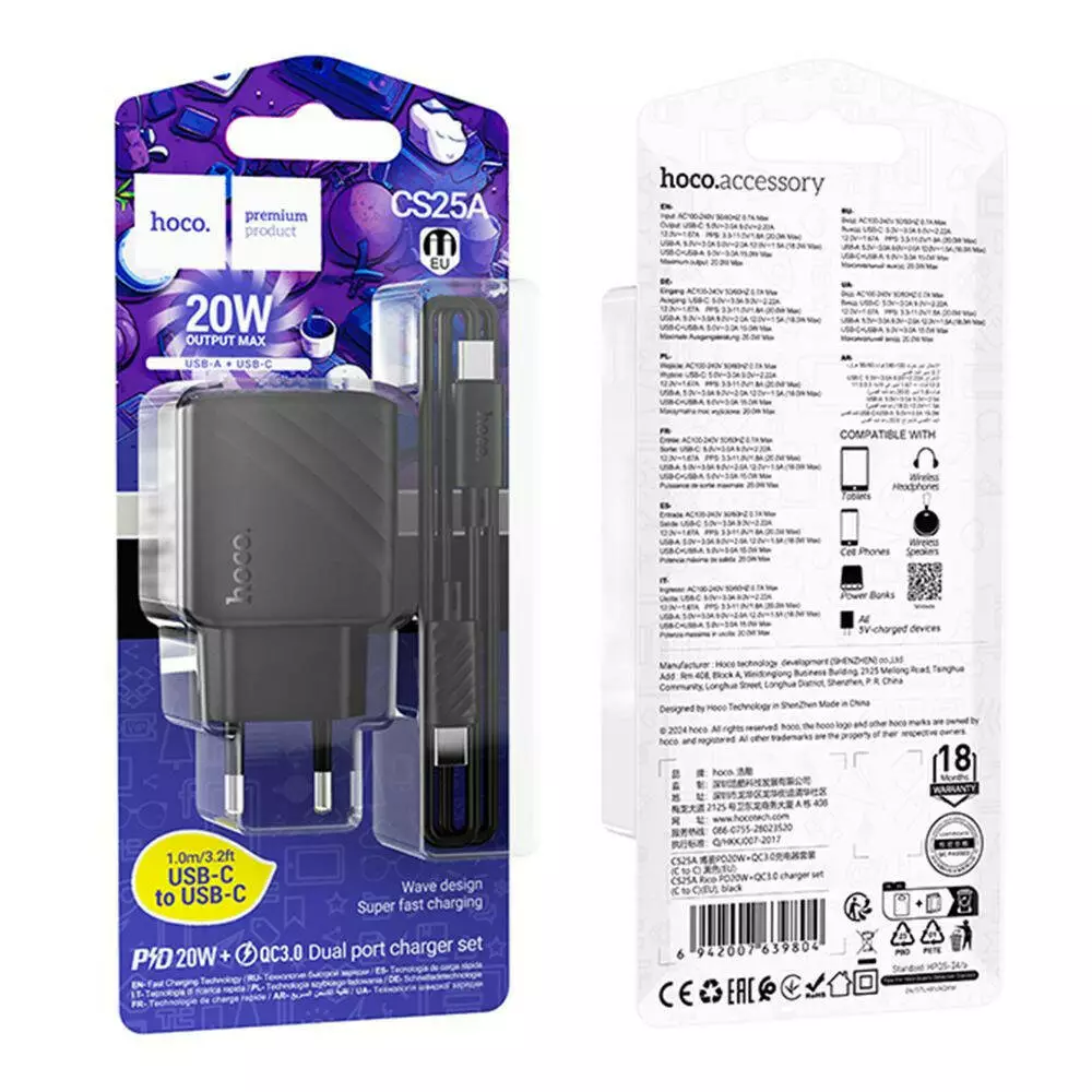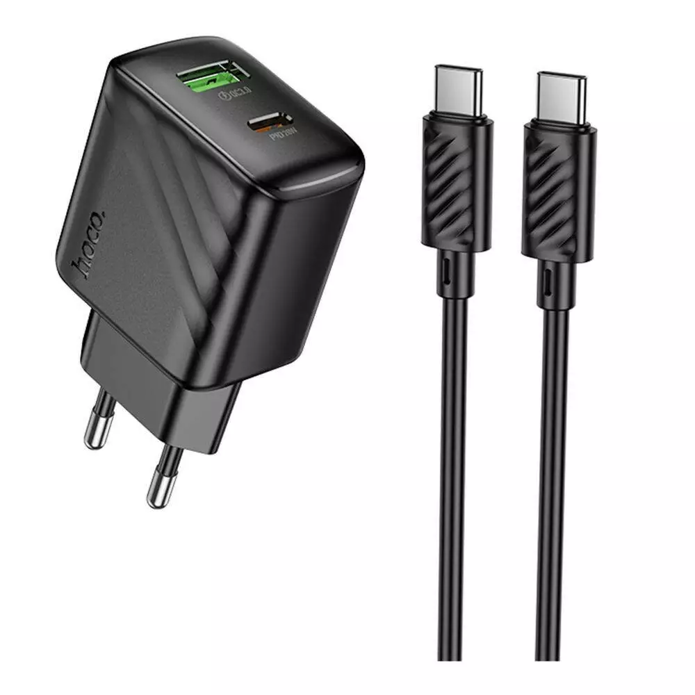 Мережевий зарядний пристрій Hoco CS25A, Cable Type-C to Type-C, PD 20W, QC 3.0, Black