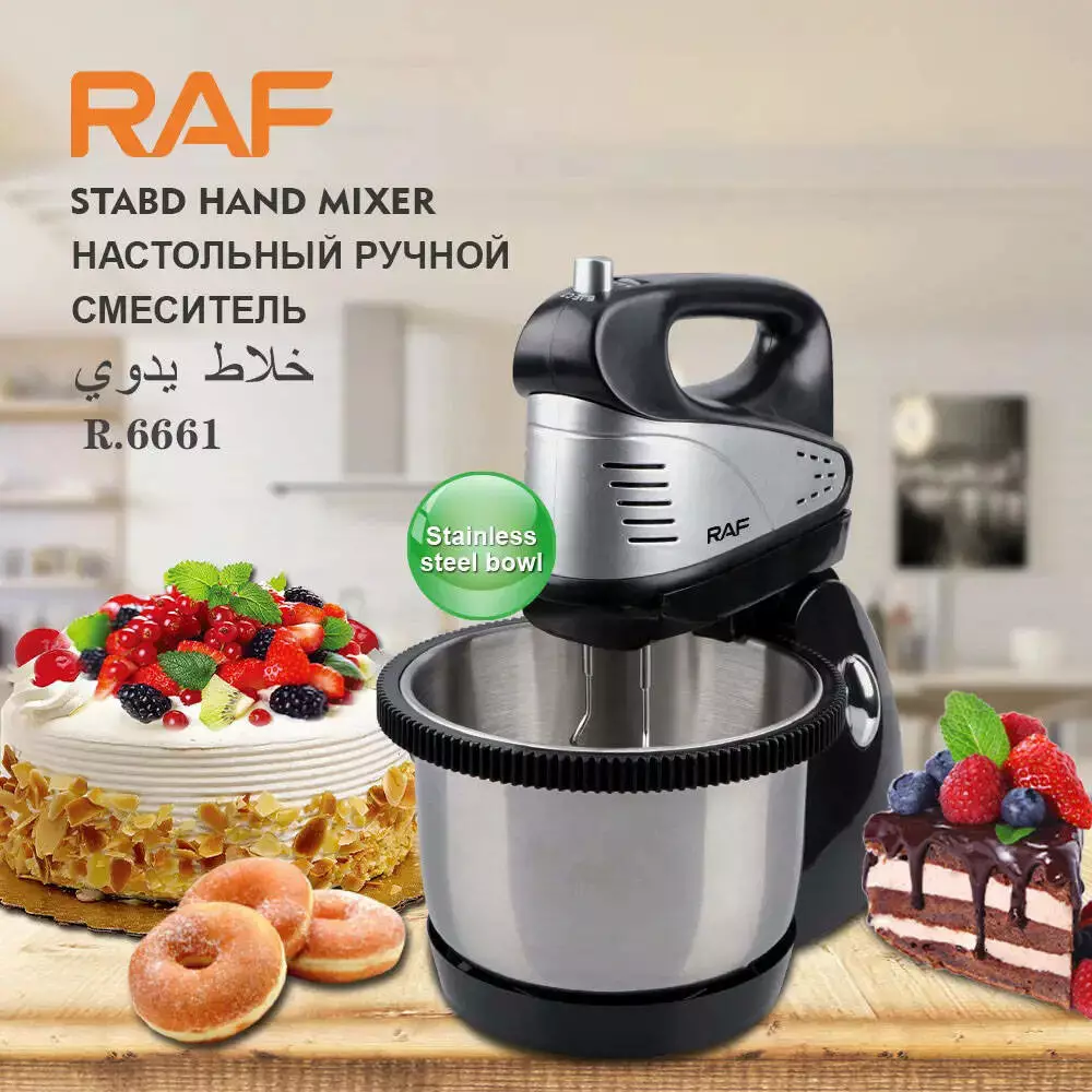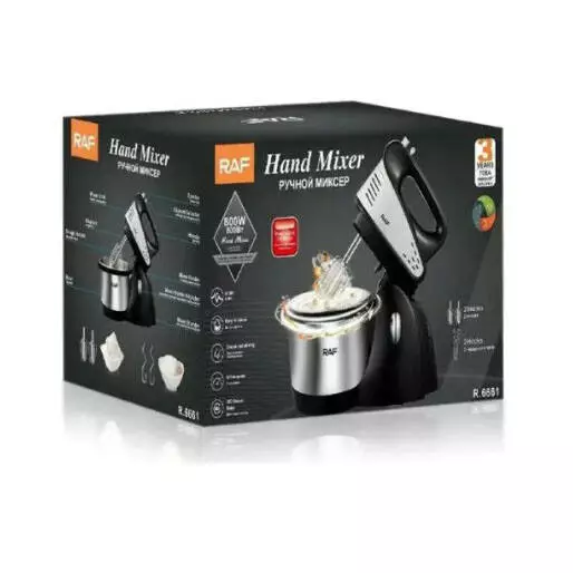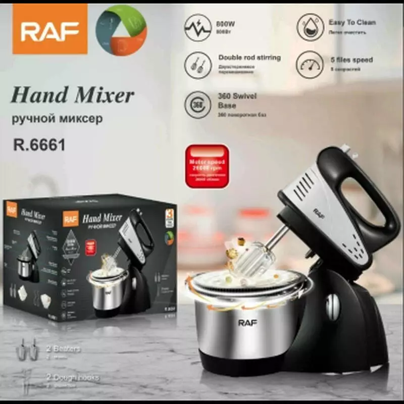 Миксер с чашей RAF R-6661 — идеальный помощник на вашей кухне. Стильная, надежная, практичная модель настольного миксера поможет вам в приготовлении кулинарных шедевров. С комбайном легко и просто готовить воздушное пюре или взбивать яйца для десерта, замешивать тесто или перемешивать фарш с помощью специальных венчиков. Готовьте с удовольствием благодаря функциональному комбайну в элегантном дизайне. Комбайн расположен на подставке и имеет удобную металлическую чашу. Не прихотлив в работе. Компактный размер не займет много места на кухне, а стильный дизайн дополнит Вашу кухню.Удобно, что имея данный комбайн Вы получаете возможность стать настоящим профессиональным кулинаром, приготовить тесто как дрожжевое так и песочное, с помощью специальных венчиков, также можно сбить яйца, пюре и многое другое.