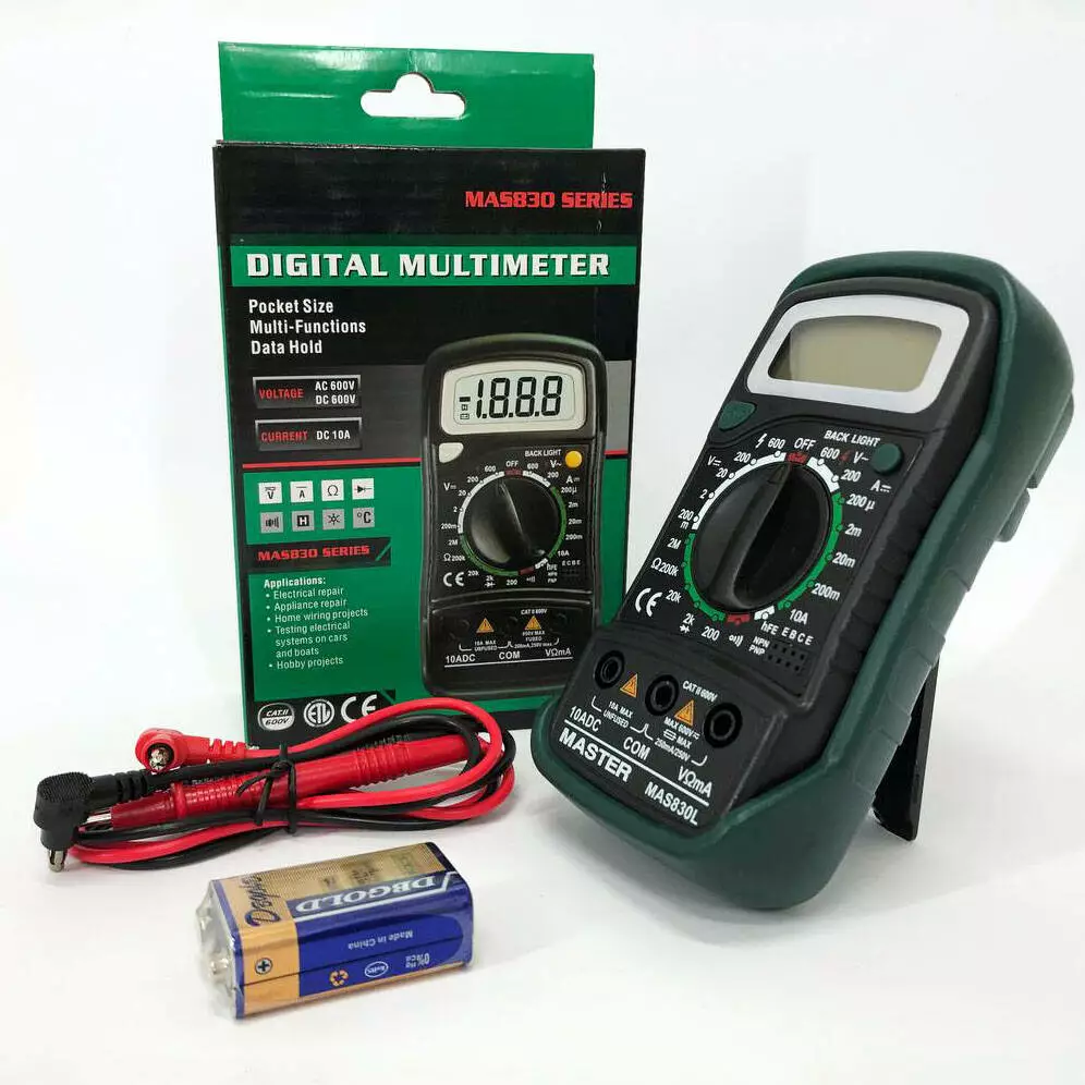 Мультиметр цифровой Mastech MAS830L - простой и надежный электронный прибор для измерений постоянного и переменного напряжения, постоянного тока, сопротивления, коэффициента усиления транзисторов, проверки целосности диодов и прозвонки электрических цепей. Выбор пределов измерения производится вручную. Также присутствует индикация низкого заряда батареи прибора. Прибор оснащен функцией HOLD для фиксации текущих измеряемых параметров, а также кнопкой BACK LIGHT которая включает подсветку на 5 секунд. Надежности и стойкости к ударам прибору, добавляет резиновый чехол вокруг корпуса.