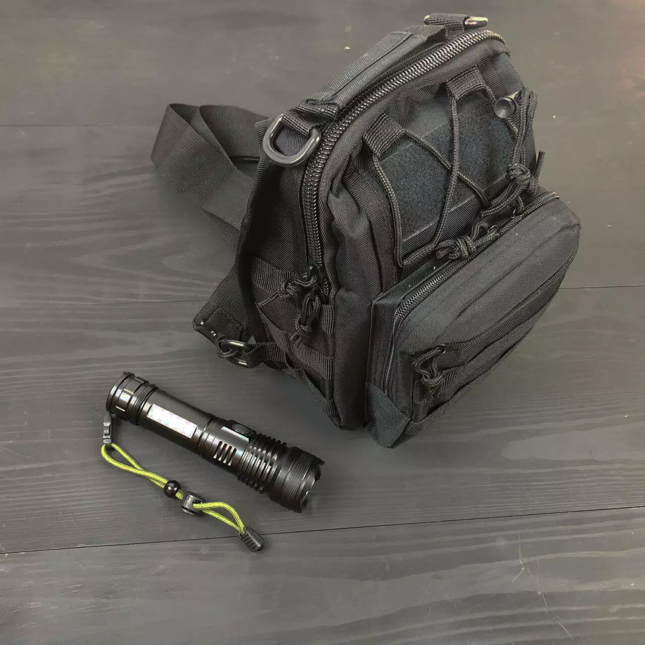 Набор: армейская черная сумка + фонарь тактический профессиональный POLICE BL-X71-P50