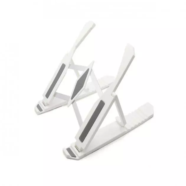 Универсальная подставка предназначена для удобного размещения ноутбука на рабочем столе. Подставка складывается и очень удобная при ежедневном использовании. Ноутбук фиксируется в нижнем положении при помощи двух фиксаторов, размещенных на передней части подставки. Такая система позволяет беспрепятственно получать доступ к разъёмам ноутбука по всему периметру. Угол положения подставки регулируется в диапазоне 0 – 45 градусов и позволяет зафиксировать ноутбук в удобном положении. Главная функция подставки – это удобное размещение ноутбука и беспрепятственная подача воздуха для охлаждения. Благодаря высокому положению ноутбука на подставке, вентилятор не втягивает пыль, тем самым увеличивается срок эксплуатации устройства. Очень просто устанавливается и складывается в компактный размер, что позволяет носить с собой практически везде. Данная подставка может использоваться не только для ноутбука, но и для других устройств: планшет, книга.