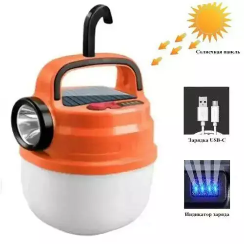 Подвесной фонарь светильник LED с крючком для кемпинга, фонариком и солнечной панелью. Цвет: оранжевый