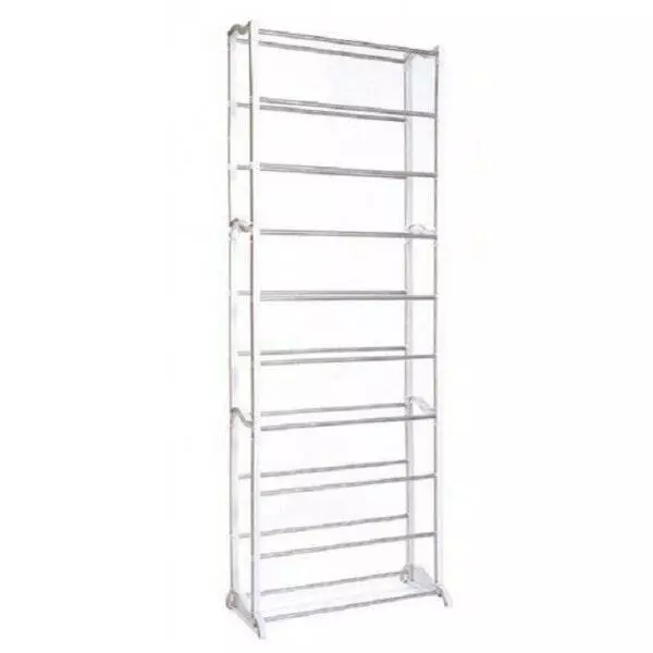Органайзер-стойка для обуви представляет собой легкую 10-ярусную конструкцию из металлических трубок-перекладин, на которых можно разместить 20-30 пар обуви.