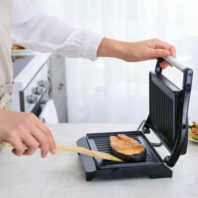 Корпус изготовлен из высококлассного термостойкого пластика черного цвета. Нагревательный элемент мощностью в 900 Вт обеспечит быстрое и равномерное нагревание одной рабочей поверхности с антипригарным покрытием.
