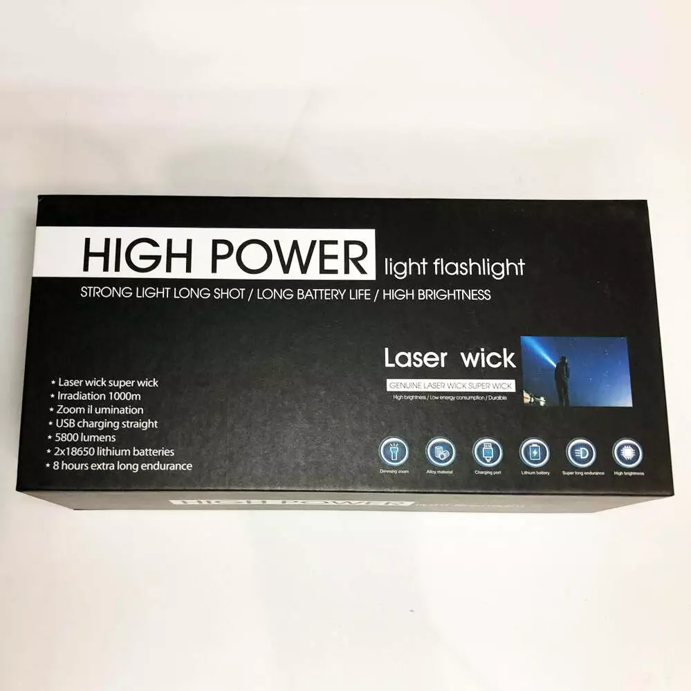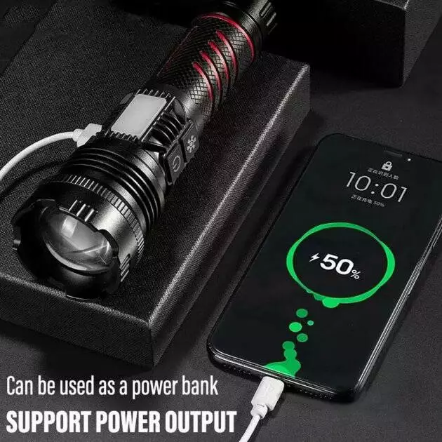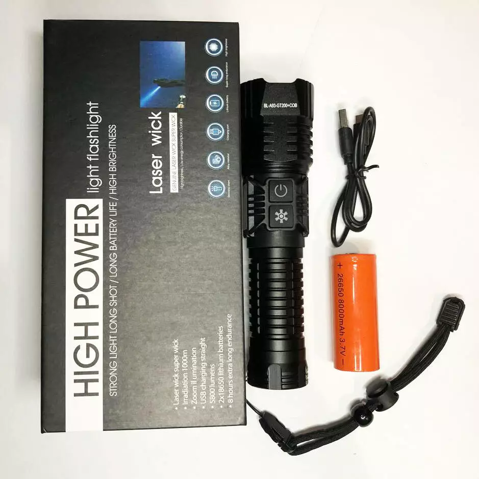 Комплектация включает фонарик, аккумулятор 26650, кабель USB